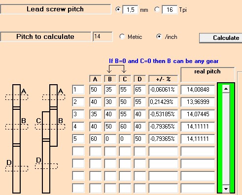 Zkus si najit "GearsVB v2.0", to je kalkulator na vypocet kombinaci kol pro ruzna stoupani na tenhle 300 soustruh. Vidis tam kombinaci pouzitych kol a pripadnou chybu v procentech.expertdb píše:Založil jsem toto téma s tím, že bych se občas na něco zeptal, co jsem jinde o malých soustruhách nenašel. Například k řezání závitů na tomto stroji. Je nějak možno vypočítat převody pro palcové stoupání závitů? Vypočítat by to mohlo jít, ale moje matematické uvažování pro to nestačí. Otázkou ještě zůstává zda to průměry ozubených kol dovolí. Dodávaná tabulka je jen pro stoupání metrické. Možná by mohl existovati nějaký prográmek, nevím . ??? Ono by mně pro začátek stačilo umět vytočit 1/2" a 3/4" závit na vodovodní trubce. Díky.