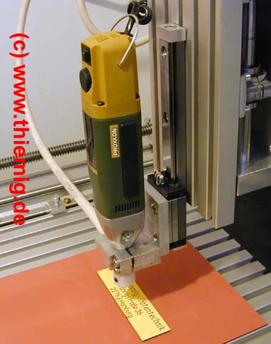 Na obrázku je dále vidět použití kousku lineárního vedení na ose Z, umožňujícího vřetenu volně plout a přitlačovat se do záběru vlastní vahou vřetene. Já toto nepoužívám, prostě ten tiefenregler naperu pár setin proti gumě (přes plošňák) a hotovo.