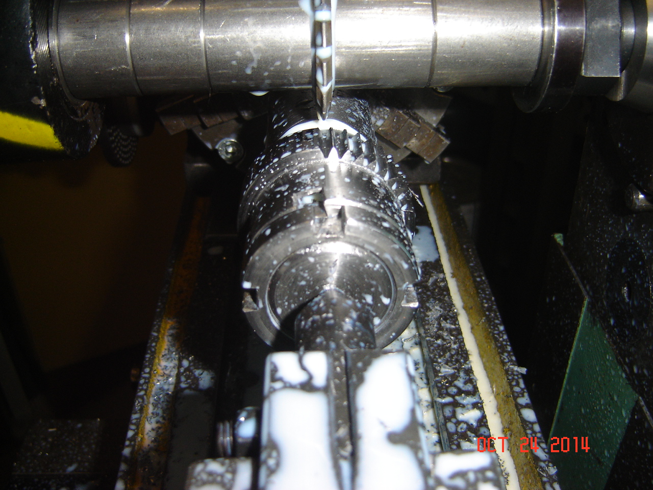 Musím něco připsat, aby to nevypadalo, že jem odložil projekt do kopřiv. Tak tedy-pár fotek z výroby ozubeného kolečka, modul 1,25, zubů 39, materiál 11600. Kolečko patří na vřeteno a slouží k pohonu posůvu a závitovacího zařízení. Na trnu soustružený polotovar, s obraženou drážkou pro pero
