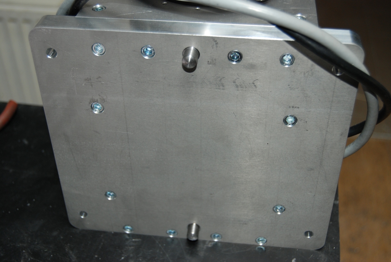 Ale celej den jsem zabil laborováním proč se mi to nedotáčí o 360st. Furt jsem myslel, že mam někde chybu ve výpočtu. Musí se vhodně nastavit krok na driveru a v Armote .... Nakonec jsem přišel na to, že ta převodovka má místo 1:50 poměr 1:51 - proč netuším. Každopádně teď už to jede přesně. Ještě byla laborace s nastavením serva. To 200W servo je na tohle dost na hraně. Harmonická převodovka asi už z principu funkce tak úplně lehce nejde. Nakonec se to ale povedlo a vhodným nastavením smyček to funguje spolehlivě. Ze spoda tam mam dva kulíky který zapadnou do stolu - takže nemusím pokaždý hledat střed osy. Kryt je z AL sendviče Debond 3mm.