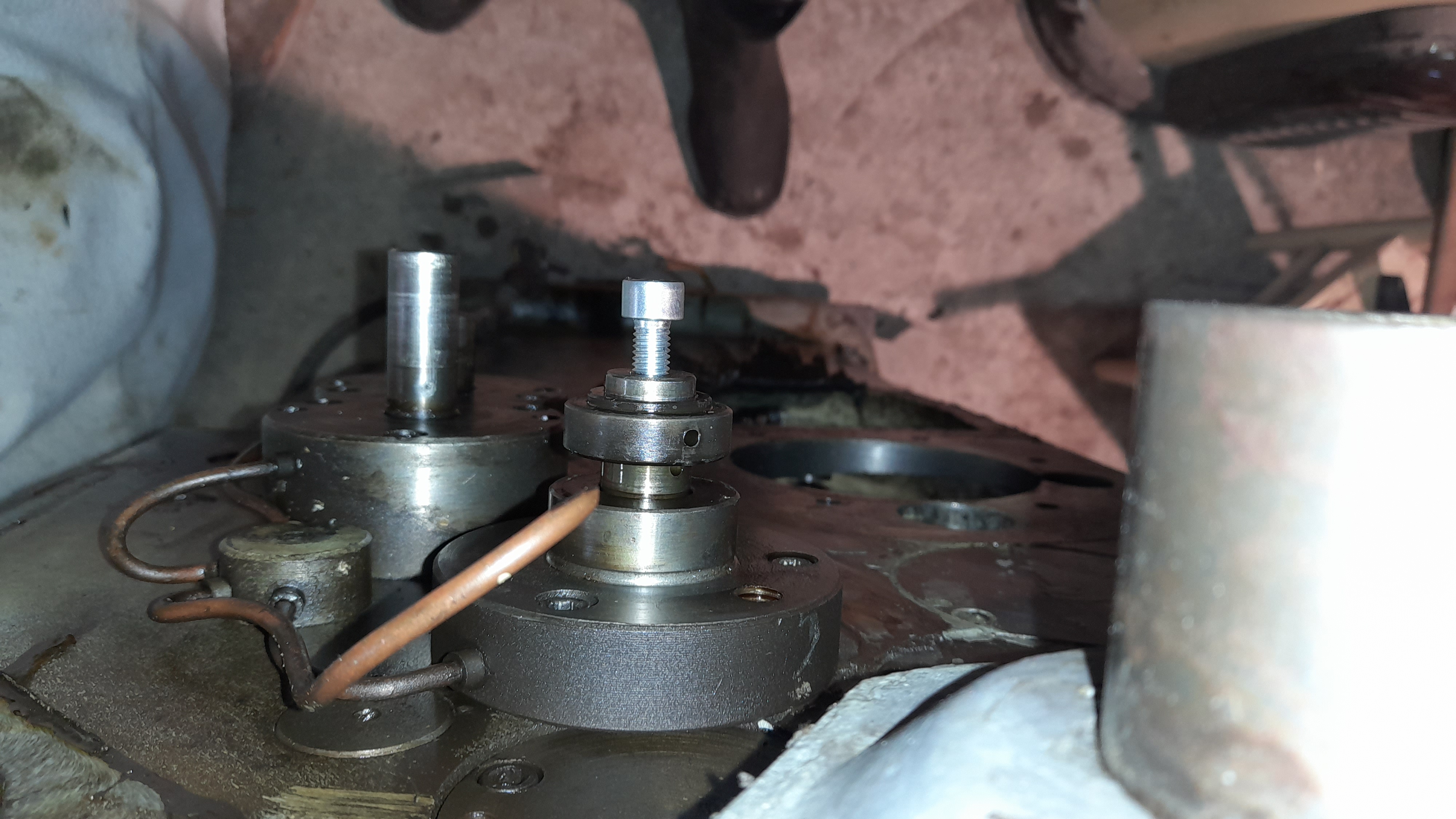 Nakonec jsem do konců hřídelů našrouboval imbus šroub (proti poškození vnitřního závitu stahovákem) a kroužky utrhnul vnějším stahovákem ložisek. Potřebuji totiž vyndat hřídele z převodovky posuvů kvůli výměně ložisek. Problémem je ale onen podružný rozvaděč mazání do z kterého vedou trubičky do nábojů k hřídelům a brání tak jejich demontáži. Ty trubičky jsou zřejmě bez poškození nedemontovatelné..... Dělal jste to někdo?