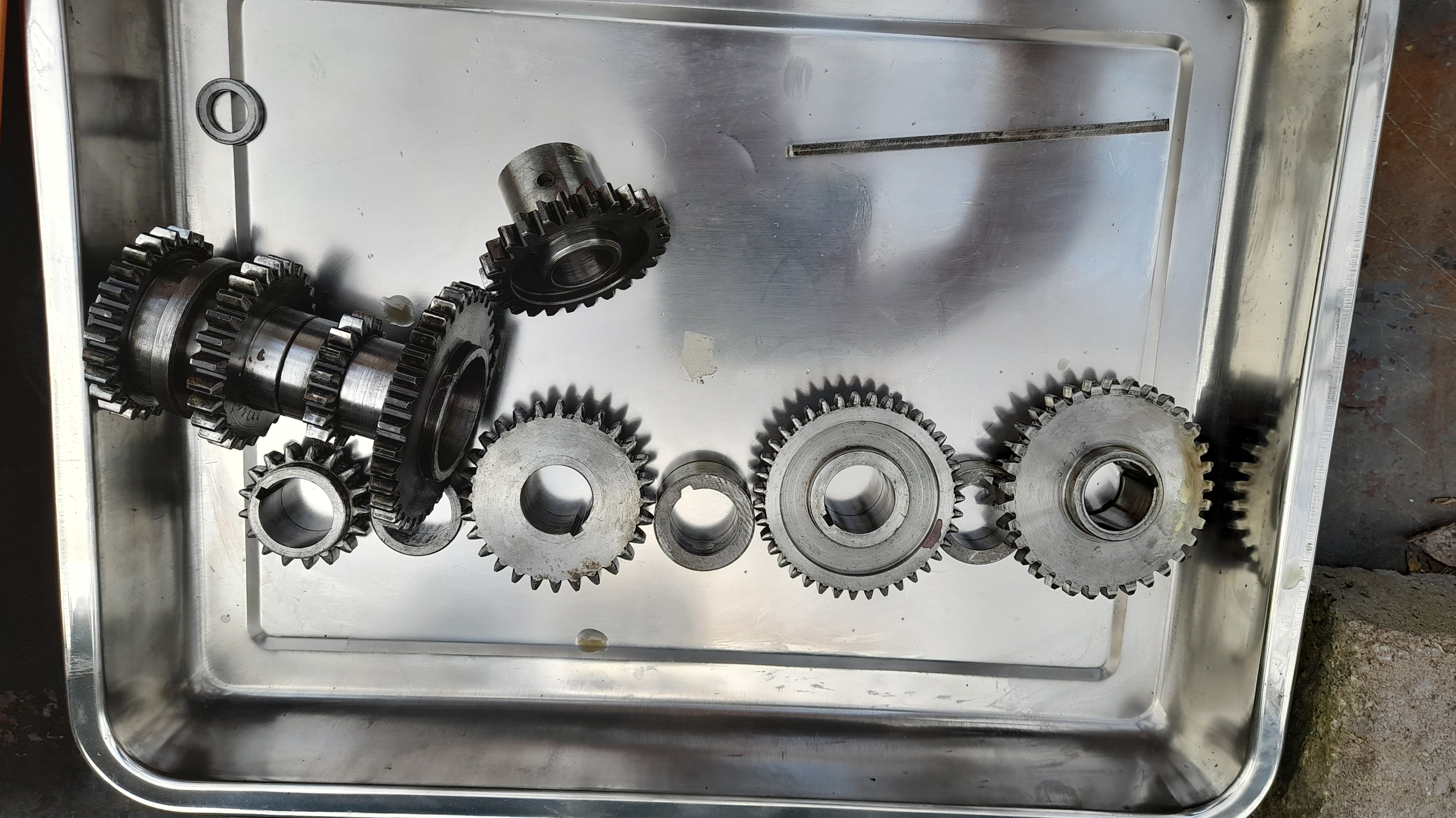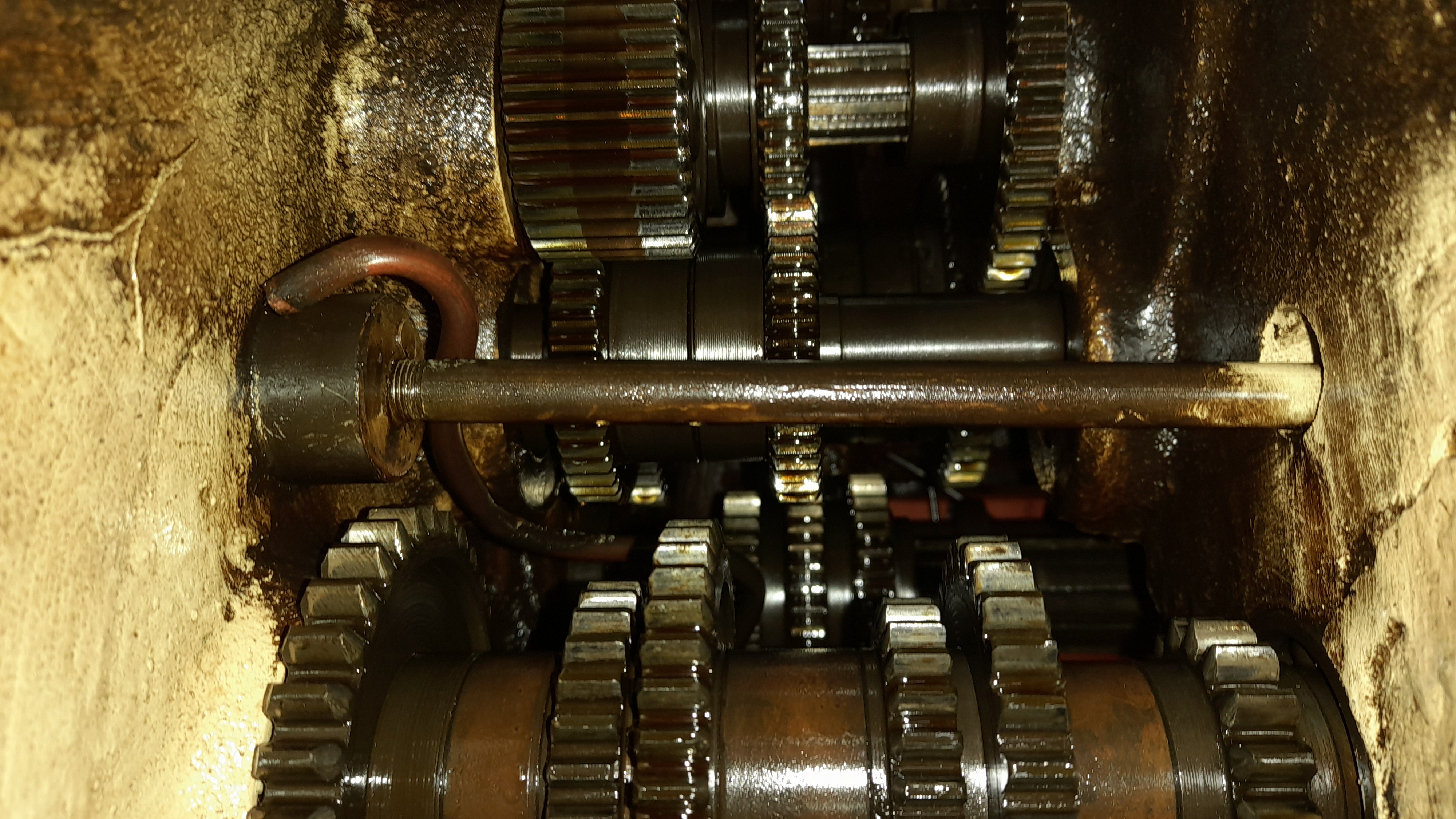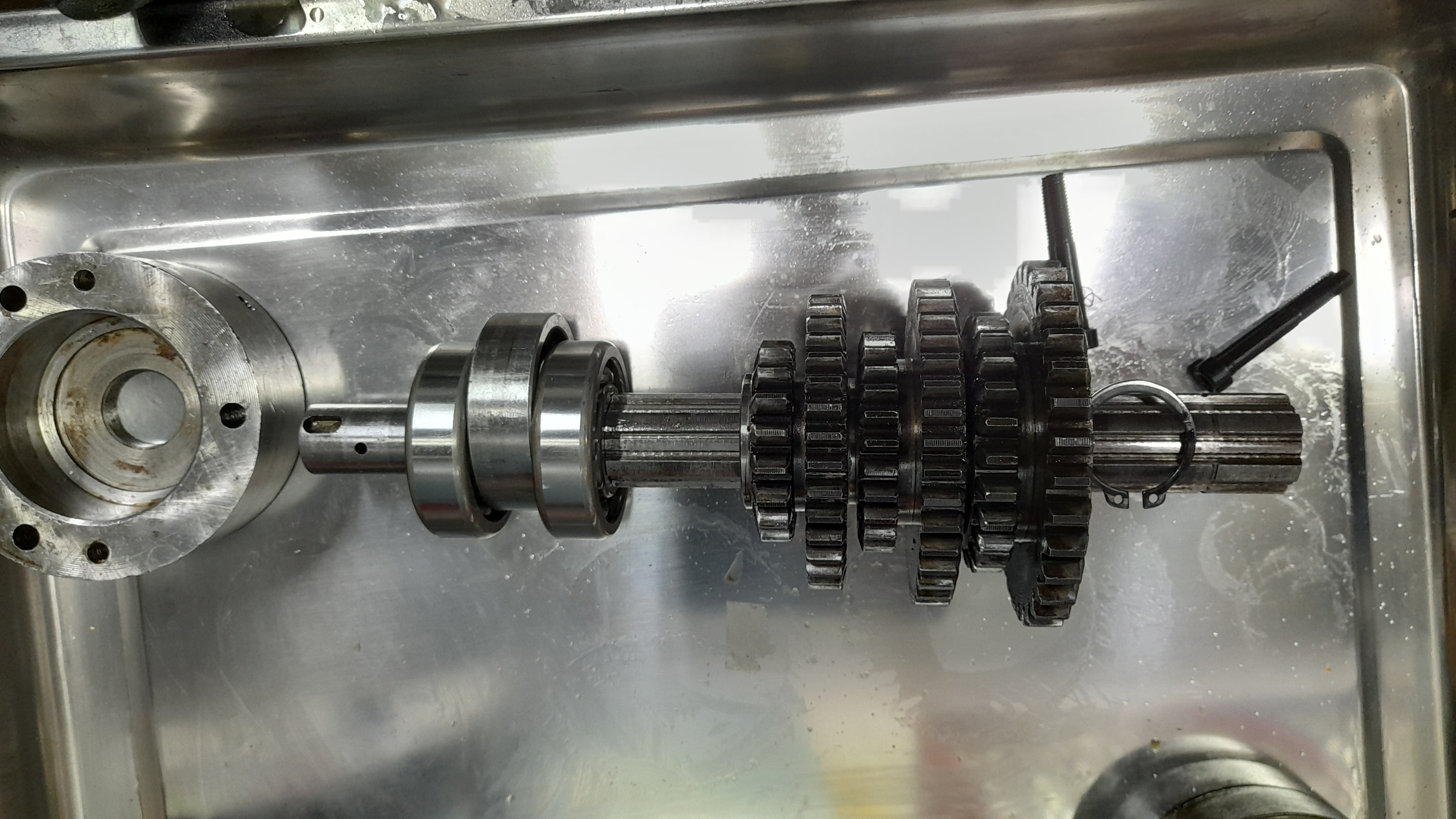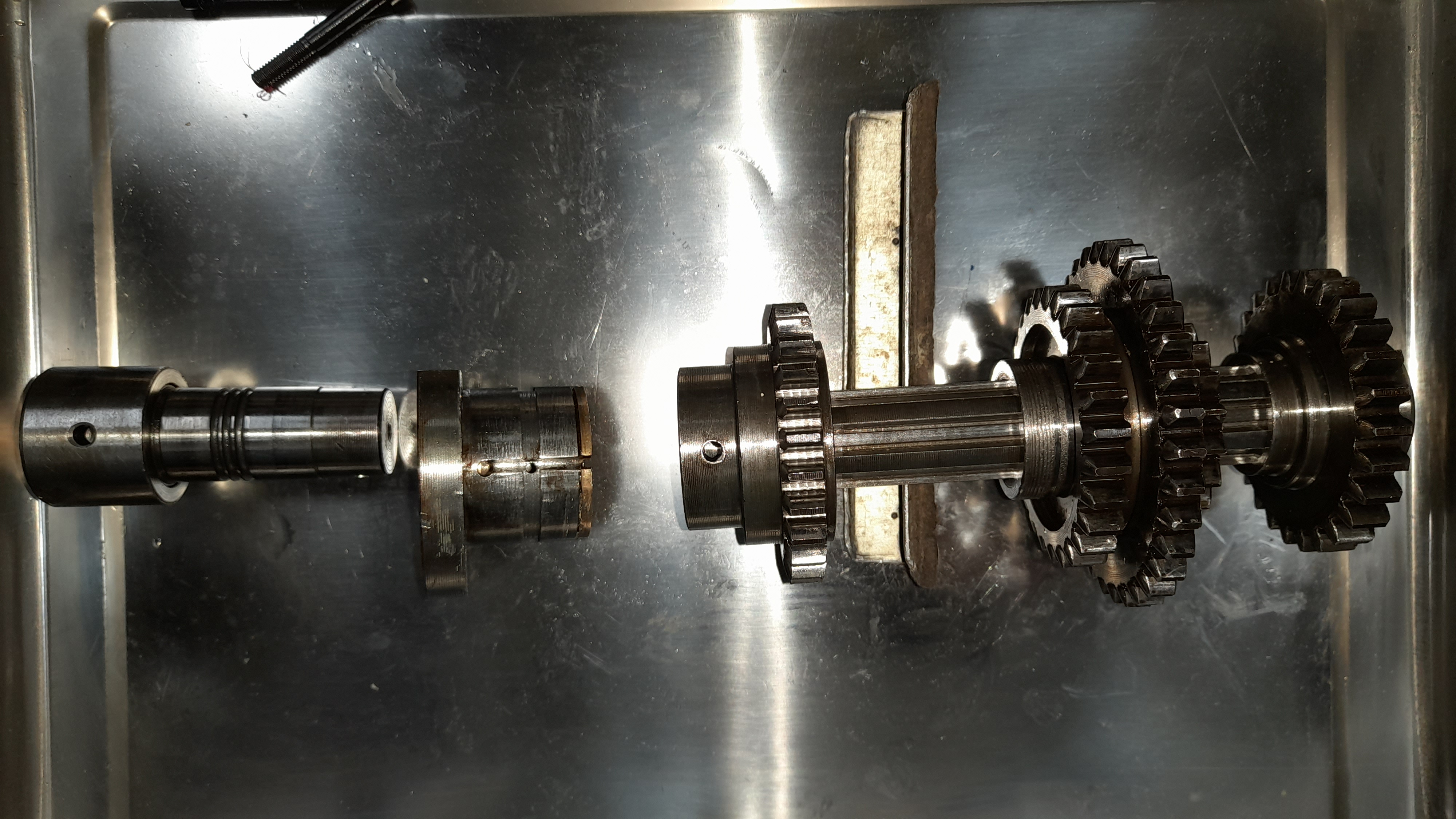 Obě hřídele i s ozubenými koly jsem vymontoval a dolní je po výměně ložisek již namontována zpět.