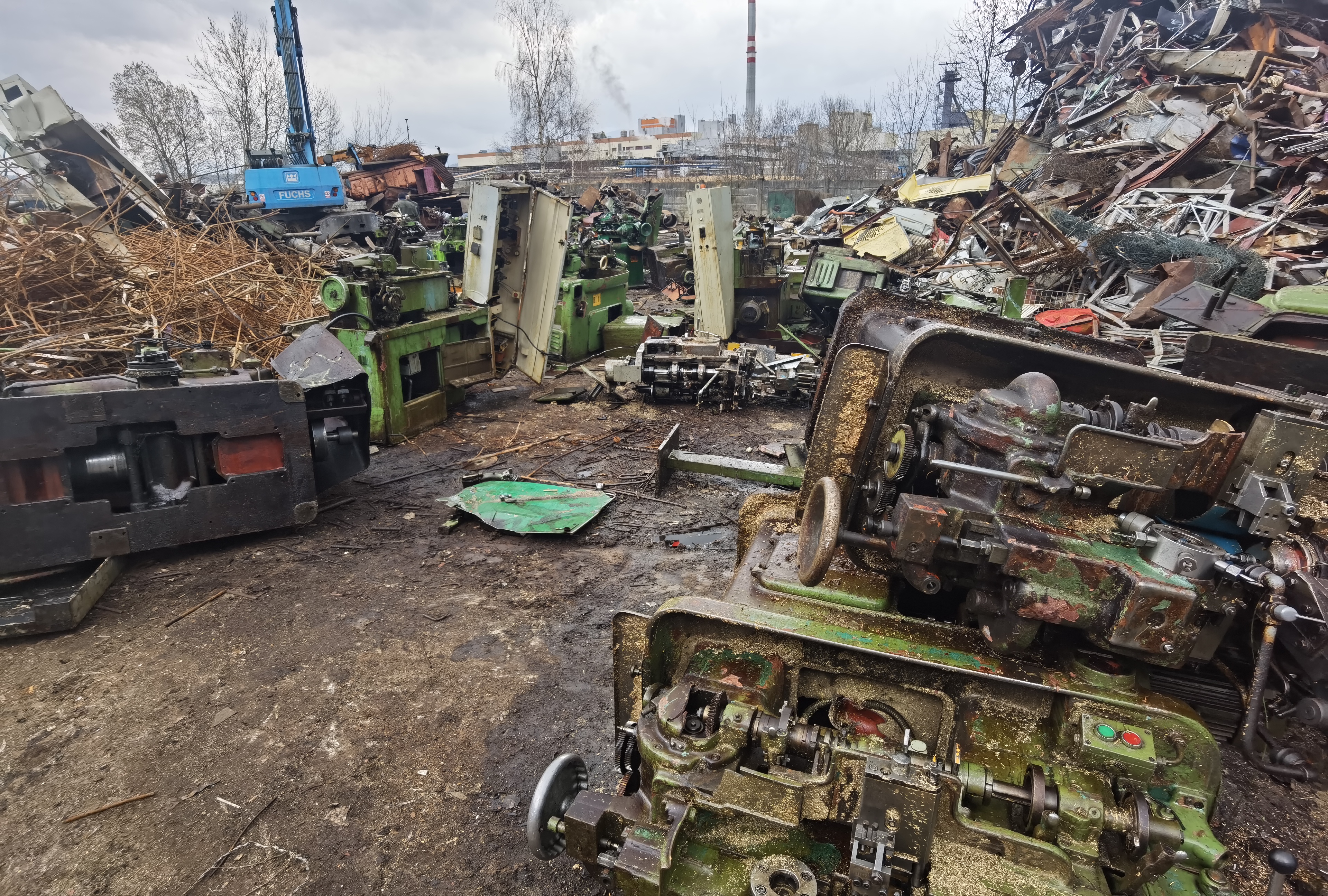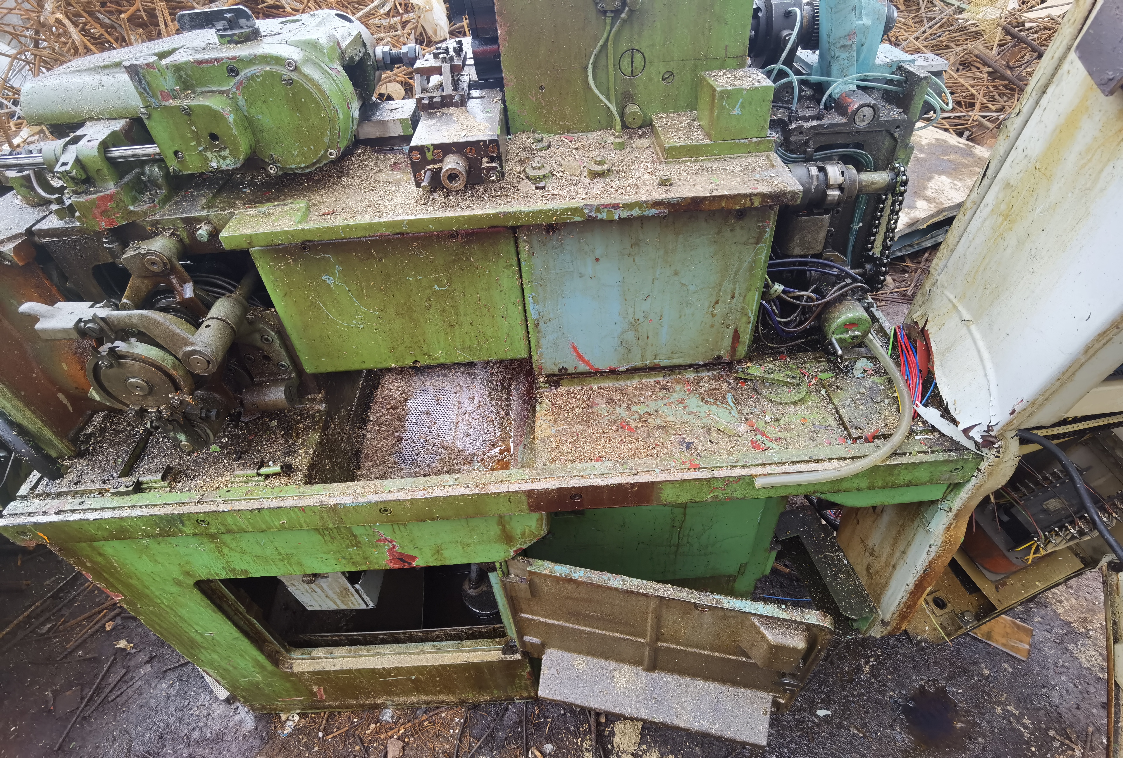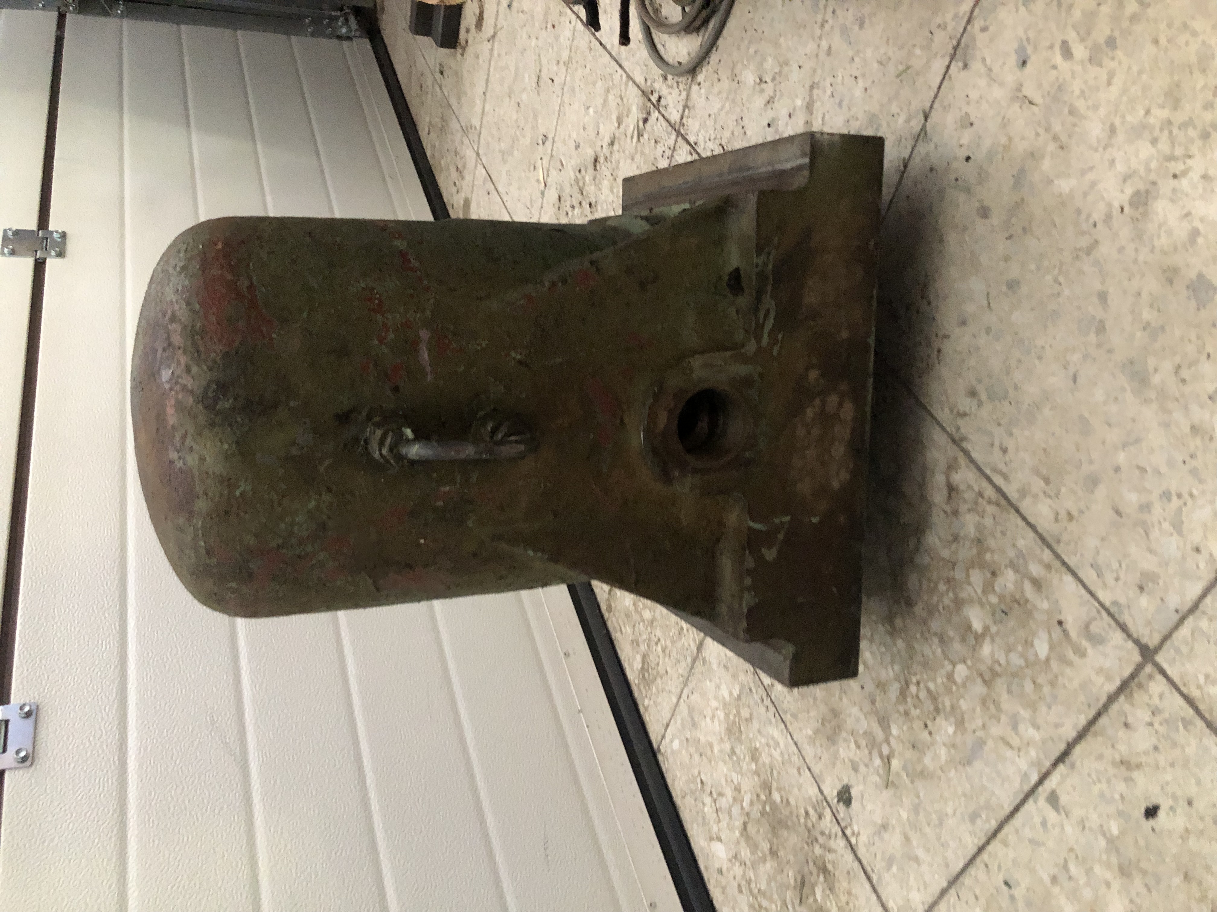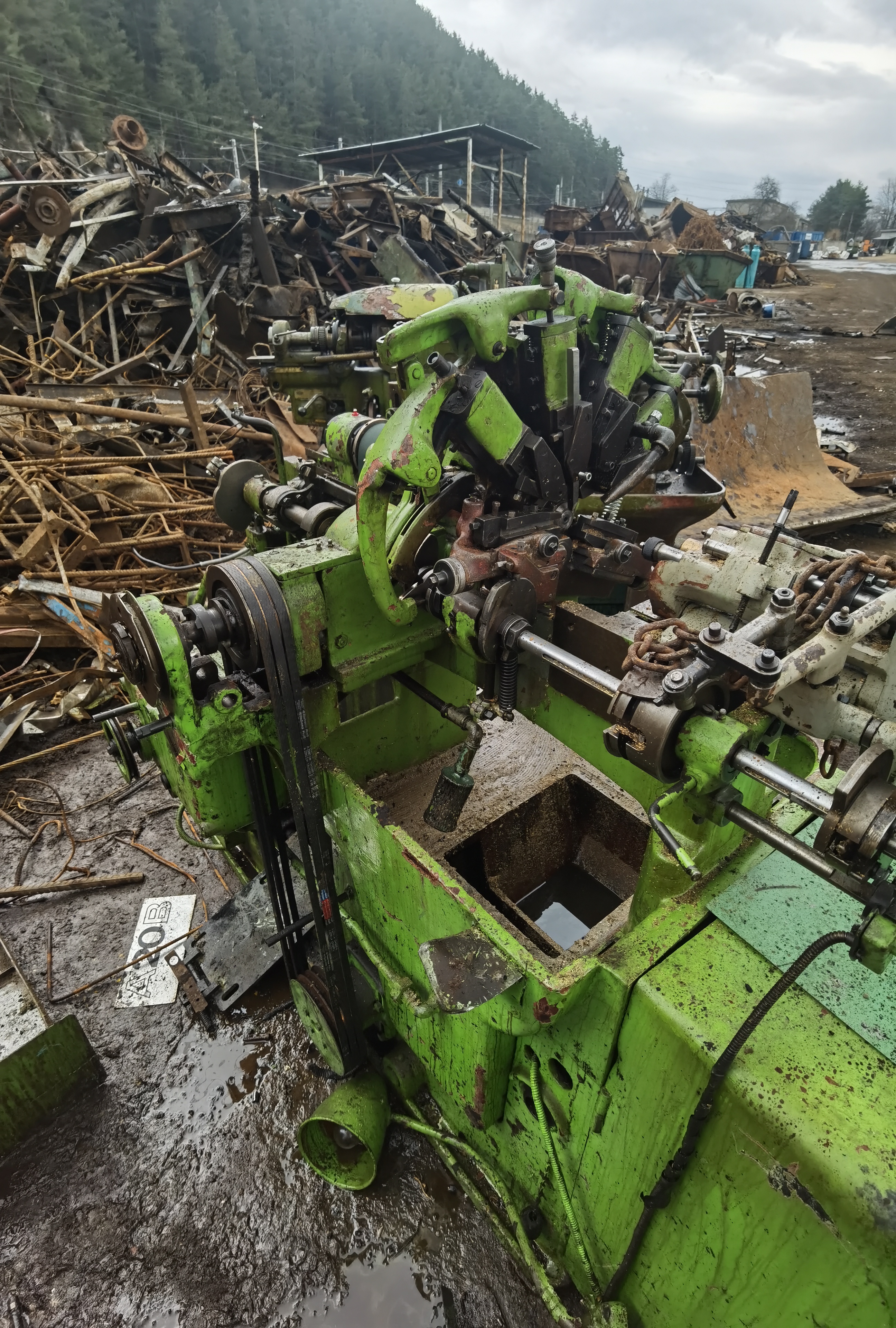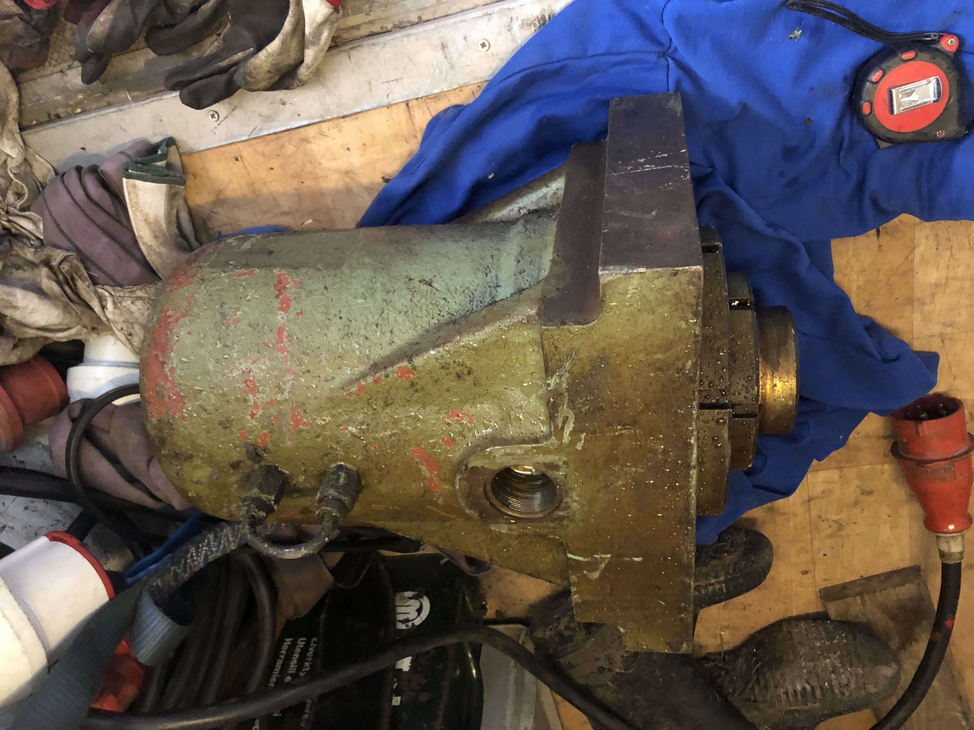 Slaný, kruhový stolek z české pilovačky, pr. cca 400 mm, naklápěcí ve dvou směrech, vedle v kontejneru příslušná pilovačka.