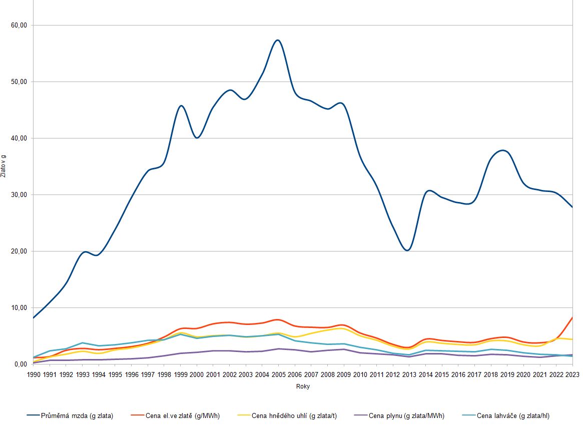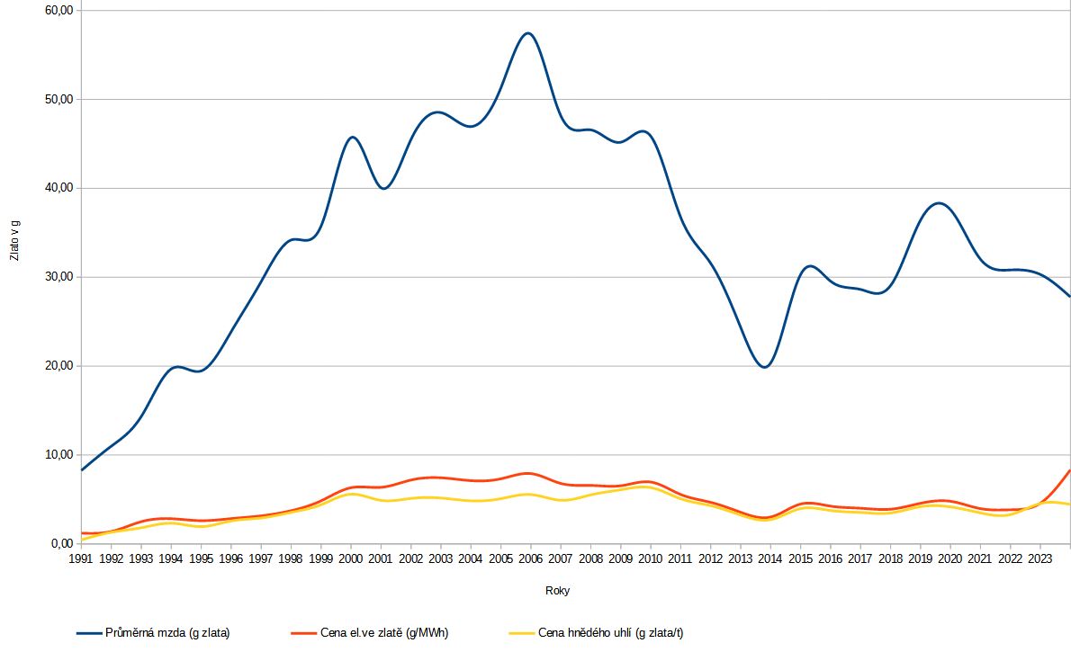 Pro malé zamyšlení jsem udělal jsem graf vývoje našich průměrných platů, ceny elektřiny a ceny hnědého uhlí v přepočtu na ceny zlata.