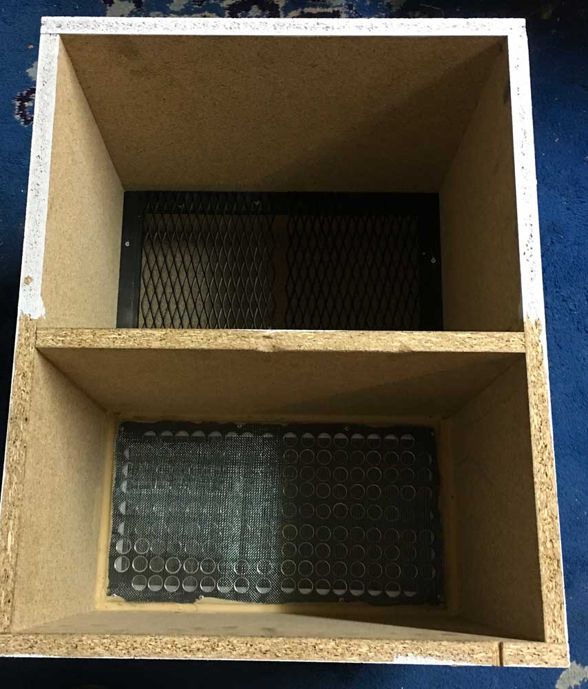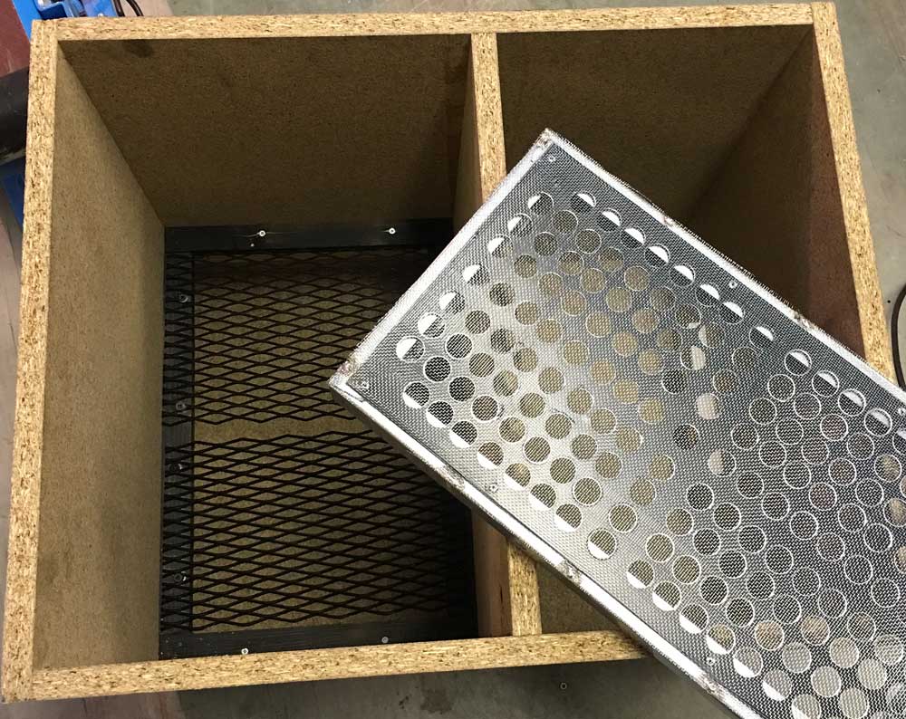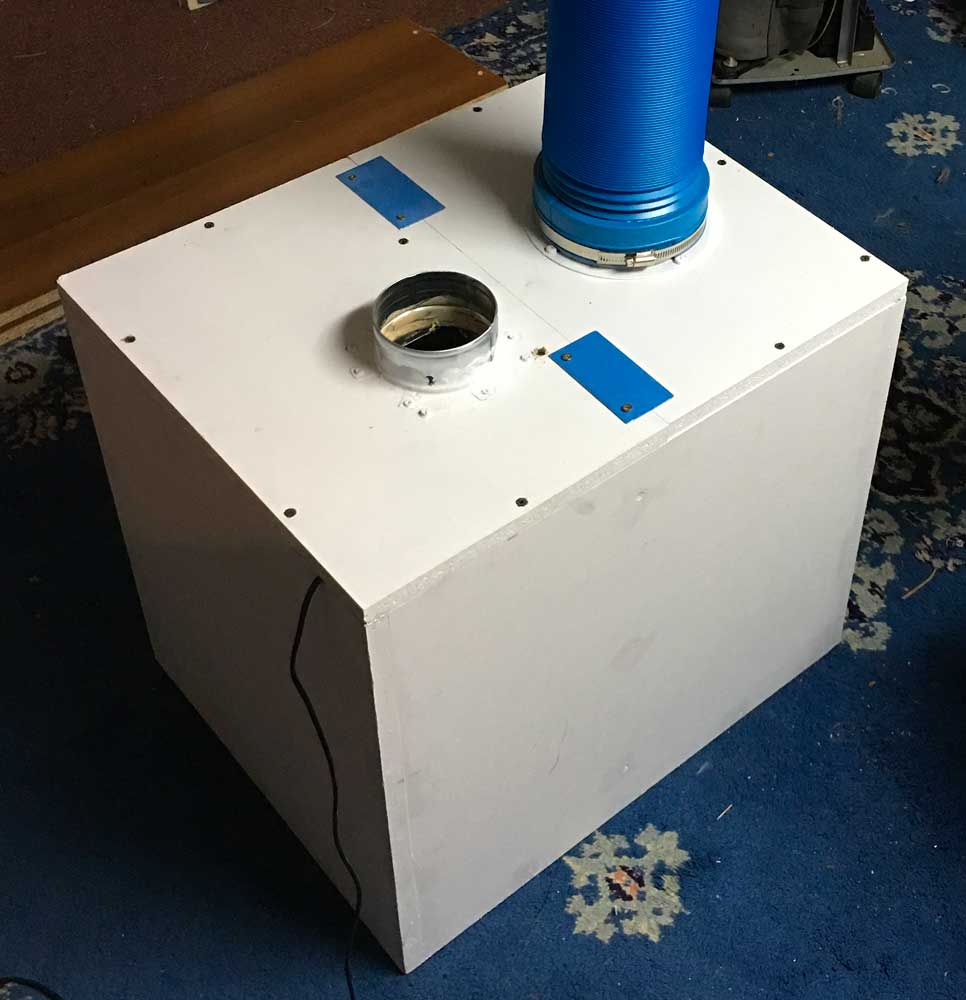 V posledním týdnu finišuju s novým laserem a tady je prachový a pachový filtr vč. odsávání. Vývojově je to asi pátá verze konstrukce, ale tato poslední je ověřena 4 rokama používání. Tlustou trubkou nasávám smrad z laseru, ten protáhnu přes 150 mm tlustou vrstvu vzduchotechnické vaty a spodem pokračuju do druhé části filtru. Tam od spoda vzhůru proženu přes 3 mm granule aktivního uhlí. Horní rámeček je o cca 3mm výš nad uhlím a tak má uhlí trochu vůli a nesesedá se jako při opačném tahu. Tloušťka aktivní vrstvy je 100mm (celkový objem uhlí 15l) Pak už jenom turbínový ventilátor a je hotovo. Bedna poměrně slušně tlumí hluk ventilátoru a tak to neotěžuje i při celodenní práci. :-)