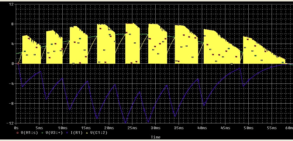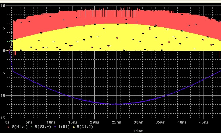 Na patem obrazku (Simulace06) je opet celkovy pohled ale je zamerne dan velice maly filtracni kondik. Je videt jak je zluta stopa (tady ta po spatne filtraci) odlisna od zeleneho pozadovaneho prubehu a jak se domrvil skutecny proud v civce.