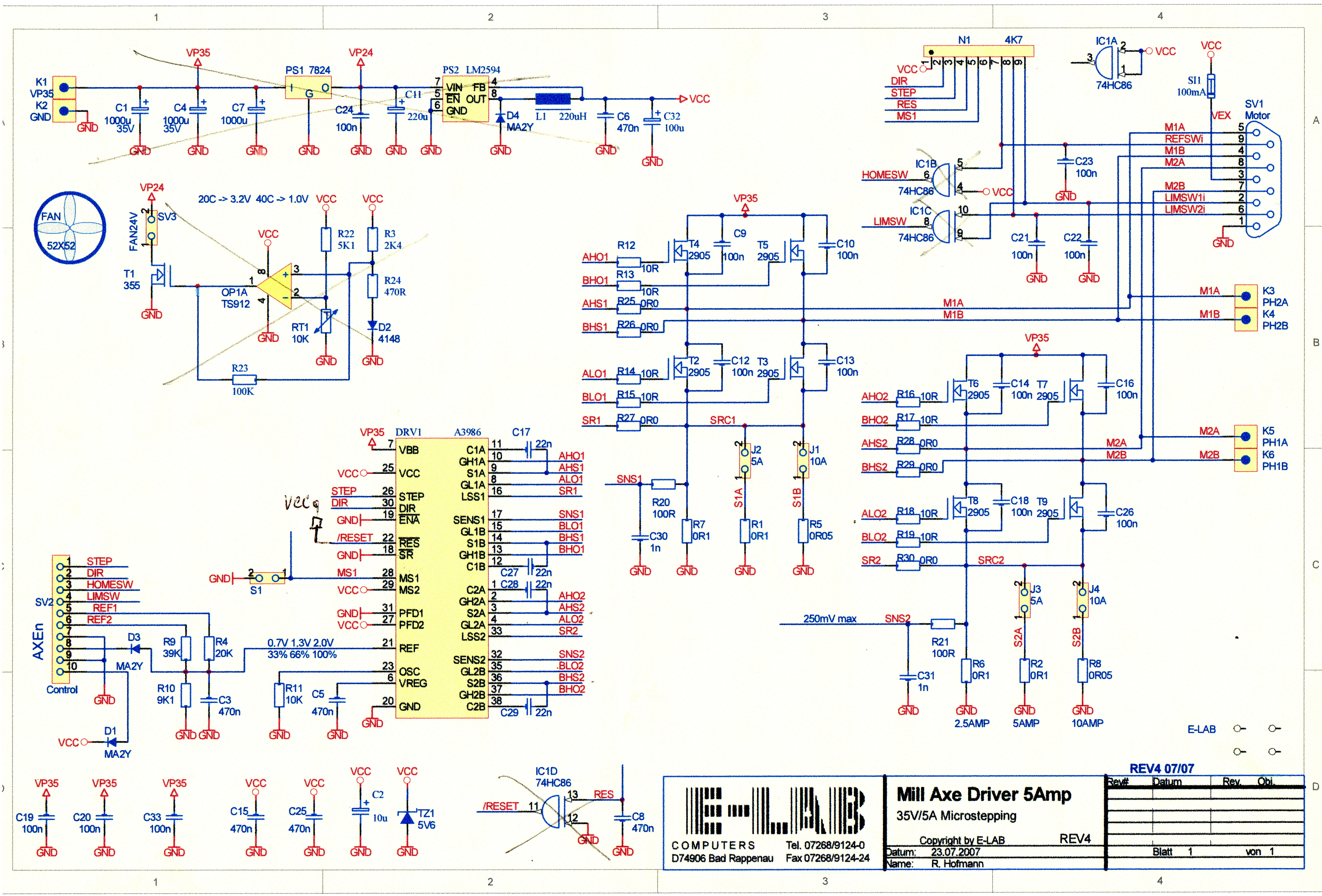 Právě před chvilkou jsem dokončil osazení mého driveru s A3986 a provedl základní test. Stav je takový že jsem použil zapojení dle mého schématu akorát jsem osadil pouze jeden bočníkový odpor na fázi s hodnotou 0.1R pro proud asi 2,5A (začněme pozvolna) a kondenzátor C5 je pouze 3.3uF/16V tantal (nechtělo se mi do GM