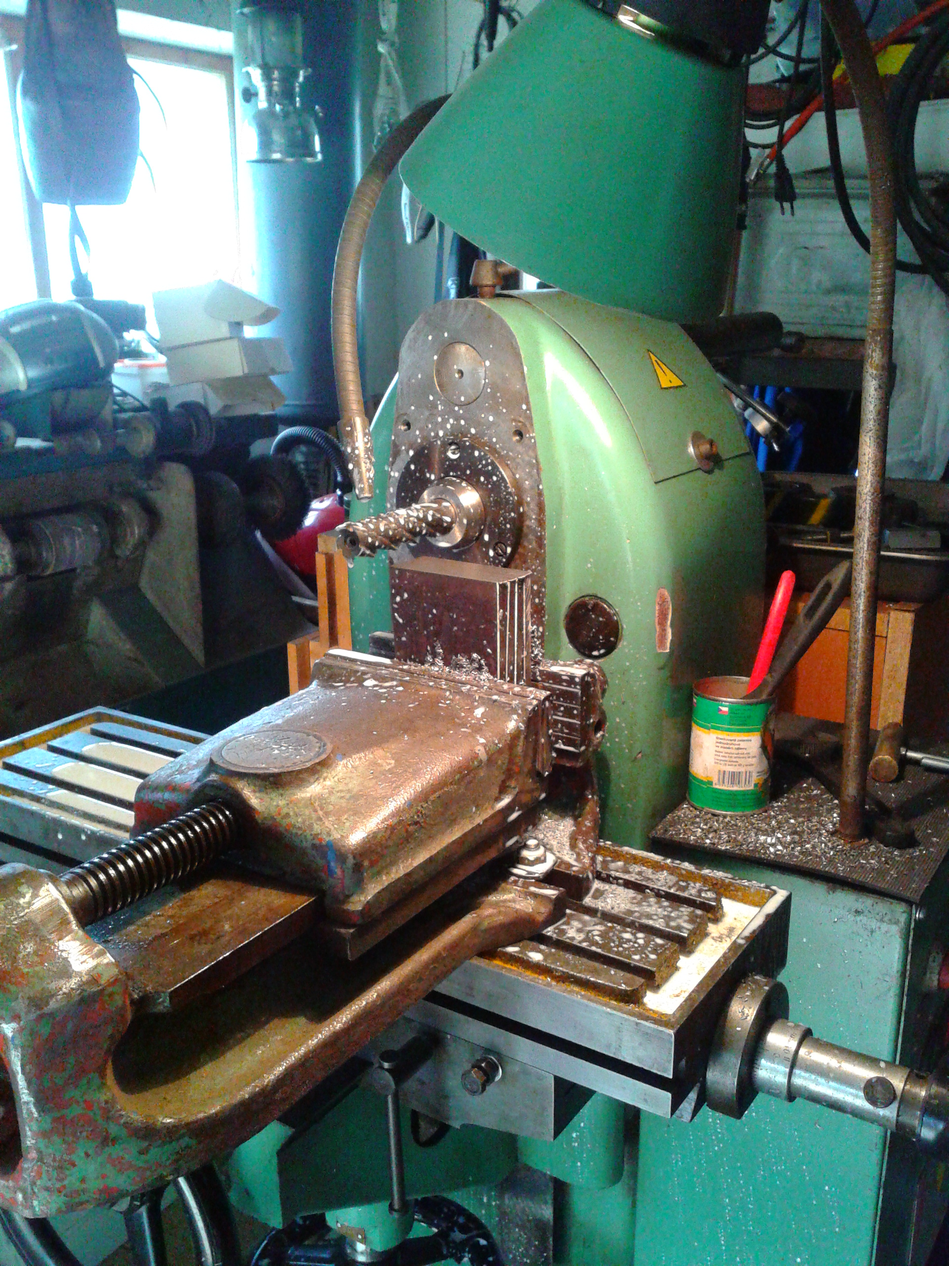 Fotek zatím bohužel víc nemám. Časem bude fotek dost. Tenhle novější typ pákovky co máš na fotce jsem obhlížel v moc pěkným stavu naživo, nicméně mě odradil strašně malý rozsah posuvů a to zejména podélného, tipuju ho cca 150 možná o málo víc. Na téhle straší by mělo být 275 podélně a 125 příčně. Další výhodu té co mám jsem viděl v protizávaží na svislé ose, vymezení posuvů klínovými lištami a v neoriginálním horním trámci, který je z obdélníkového plného bloku oceli oproti originálnímu oblému a dutému. Ta novější má sice vícedrážkový stůl který je i širší, ale já plánuji dát na originální stůl jěště desku s T- drážkami. T.drážkovou desku, vertikální rychloběžnou hlavu a frekvenční měnič mám ve svých syslátech. Navíc frézka má originál vyřešené chlazení i se zvládnutým odvodem emulze a půjde snadno a účelně zakrytovat.