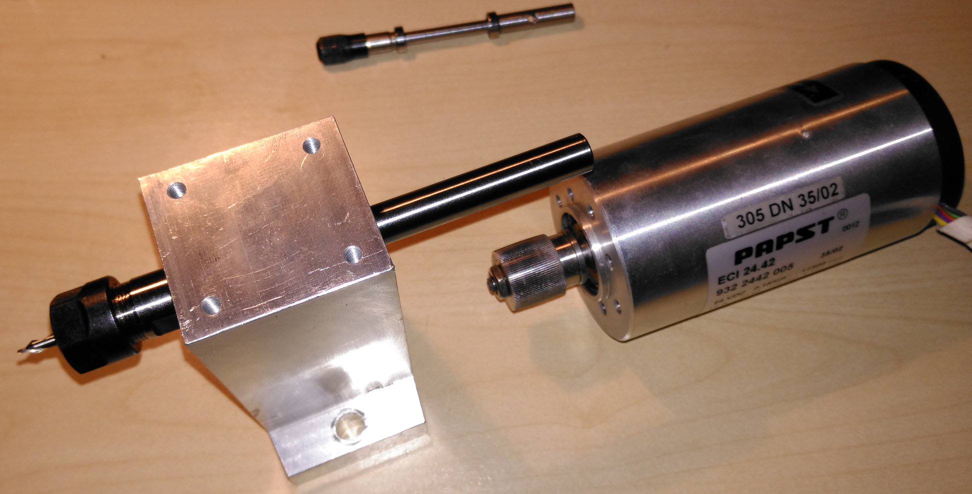 Upínač zasunutý v ložiskách, BLDC motor 11500 ot./min v pozadí Timovo vřetýnko...