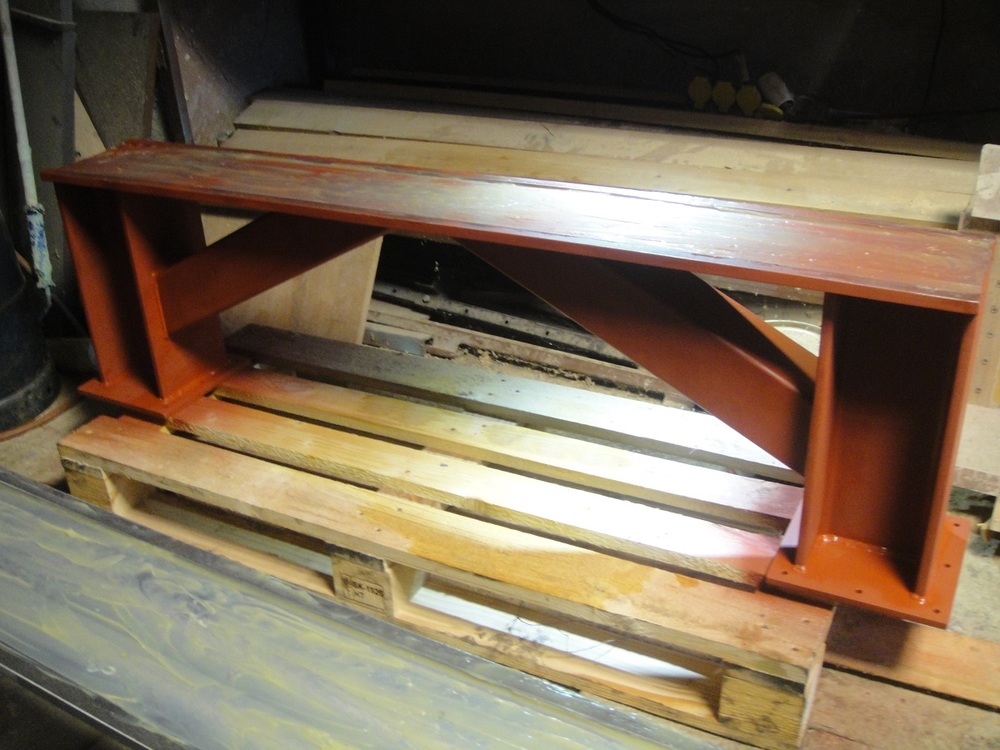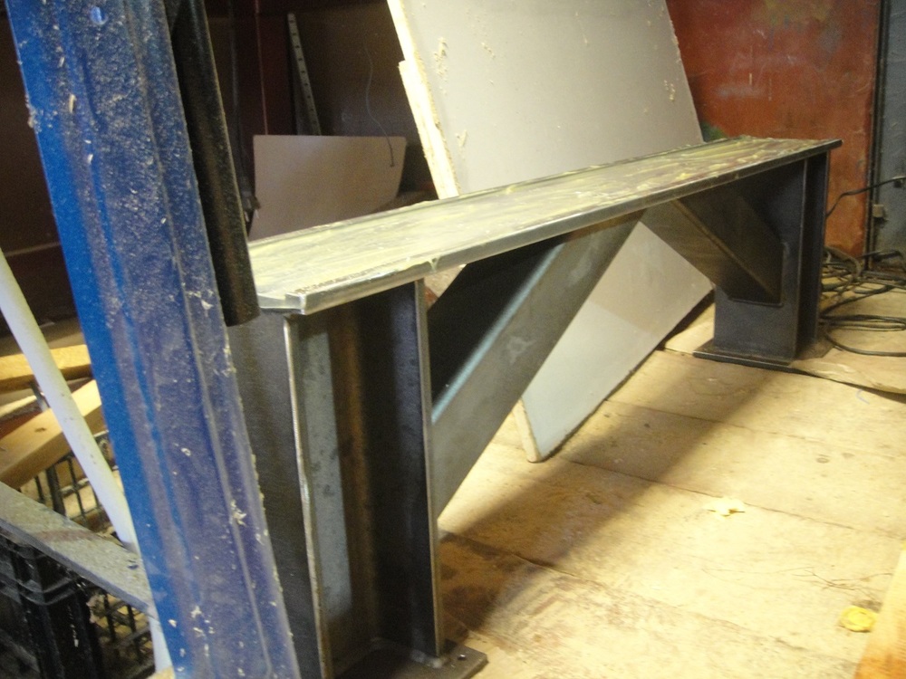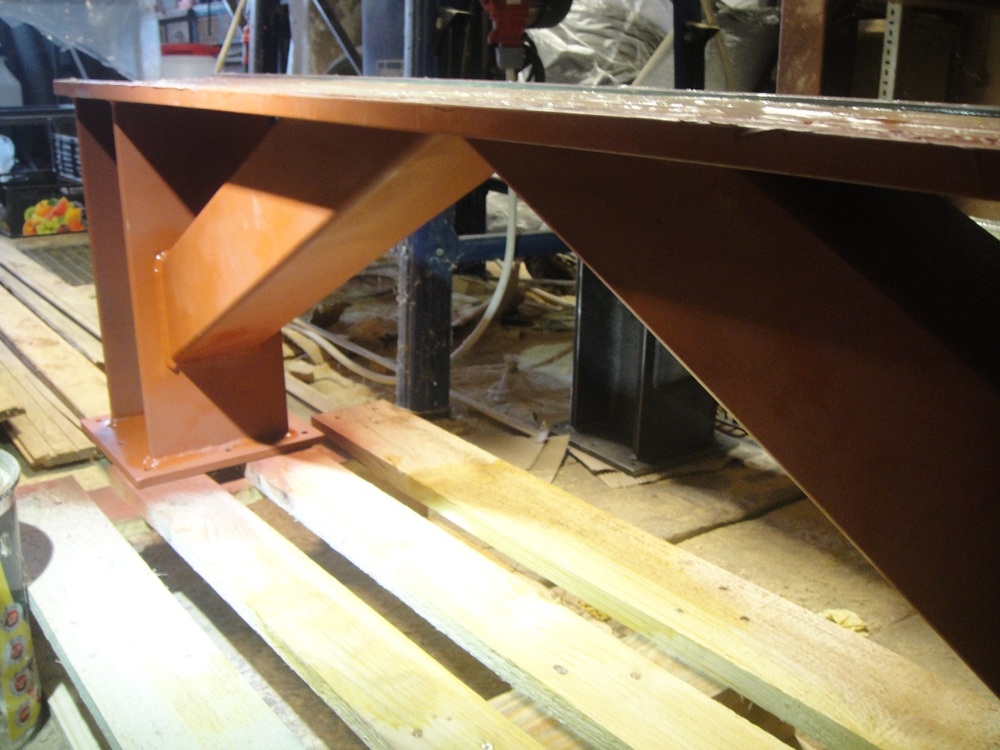 Noha je pozvarana z beznych profilov a obrobena na freze.Neskor sa bude este brusit.Fotky su trocha z blbych uhlov, lebo som nohy po nastriekani zakladnou farbou musel odlozit na zimu do kuta.