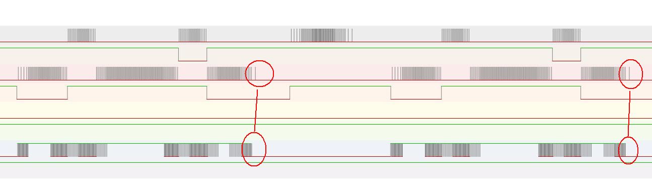 Na druhém obrázku je to samé s dynamickým řízením výkonu. A tady je vidět, že osa ještě dojíždí (ještě se generují poslední pulzy STEP), ale laser už je v předstihu vypnutý!