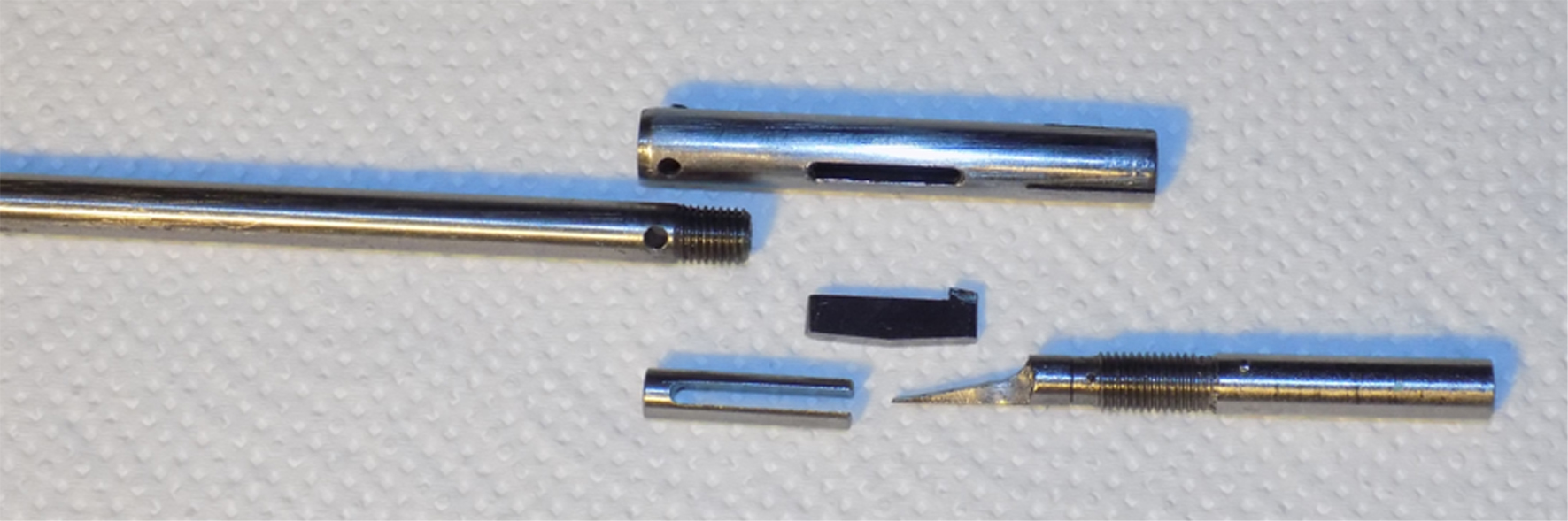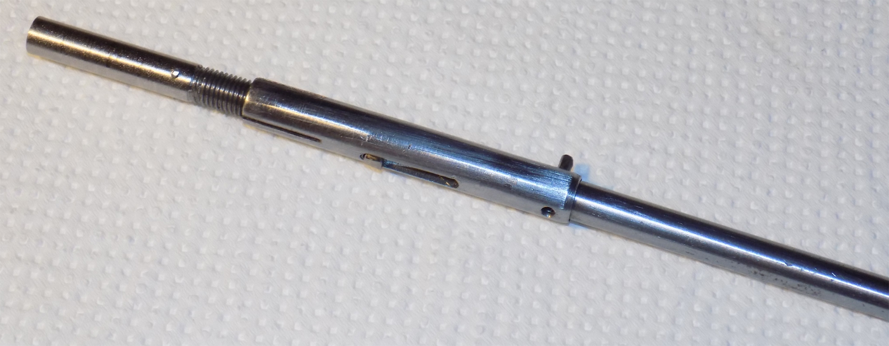 Vstupní materiál: Nemá cenu díru pro hlaveň vrtat - je to práce navíc (i když dlouhým vrtákem to jakžtakž jde, ale je to opět práce zdlouhavá a pracná a vrták musí být dokonale nabroušený). Cena vyvrtávacích tyčí je astronomická a u malého ø a velké délce vrtání stejně uhne - tedy rovnat "na průhled". Na trhu prodávají přesné silnostěnné trubky od ø 3 mm v různých obstojných kvalitách materiálu - sice to není (po staru) třída .15, je to třída cca .12 - tedy obstojná ocel. Tedy materiál je třeba získat již předvrtaný. Na rozměr "před vystružením" se opatří vrták příslušného rozměru (podle ø o 0,1 až 0,2 mm menší), nejlépe s dlouhou stopkou, stopka se stočí, na těsno nasadí do díry prodloužení vrtáku a zakolíkuje. Prodloužení se musí v souběžné lunetě stočit na rozměr vrtáku. Vrtá se pomalu za vydatného mazání a vracení vrtáku kvůli šponám. Nemusí se snad podotýkat, že větší soustruh je nezbytný a točná délka mezi hroty zhruba odpovídá možné délce hlavně. Vrtá se v kleštině, vrták neuhne - je veden předchozí dírou. Potom se musí díra vystružit na přesný rozměr (doporučuje se o 0,01 mm menší ø). Výstružník "na míru" se v obchodě nesežene, použije se s dostatečnou přesností stavitelný výstružník, který se musí opět prodloužit (nevařit - neničit - tenčí trubku splácnout do 4-hranu) a po setinkách přidávat. Tím se vytvoří rozměr v polích. Nezbytné je kvalitní měřidlo - ideální je "dlouhé" subito, ale lze si i vytvořit jednoúčelový kalibr s dobrou a zmetkovou stranou - na měření postačuje mikrometr. Rozměry díry v polích musí odpovídat příslušné normě, povolená tolerance je +0,03 mm (asi do roku 1970 byla tolerance +0,05 mm). Jednu setinu třeba ponechat na zalapování pole. Nehledat v tom žádnou vědu: do podélně rozříznuté tyče se vloží a obtočí šmirgl a postupně od hrubého až po jemný lze vytvořit axiálním posuvem na poli téměř zrcadlo. K dokončení lze použít i brusné pasty a plstěný vytěrák hlavní. Třeba nezapomenout, že hlaveň se vyrábí na každé straně alespoň o 20 mm delší - vyústění děr při ruční práci má již větší rozměr, a proto se ve finále konce odříznou. Pro další škrábání je nezbytné si na materiálu vyznačit - vyrazit značku, kde je začátek (čelo hlavně), protože v tom samém směru pak bude procházet střela - nesmí opačně. Nyní je hlavňovina finálně vyrobená v polích a dále do nich již nebudeme sahat.