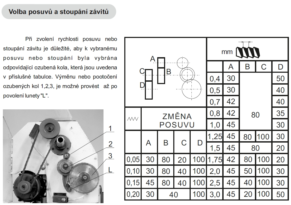 Na to budeš potřebovat ještě spočítat zuby u toho kola co je přímo na vřetenu. Jestli to chceš i s posuvy, tak začni u nějakých 0.05 mm na otáčku. Není to nezbytné, ale použít to pro dokončení nějakého dílu aby měl pěkný, rovnoměrný povrch to bude užitečné. A potom ty závity, běžná metrická stoupání, zvážit jestli hodláš používat nějaké atypické třeba pro optiku apod.