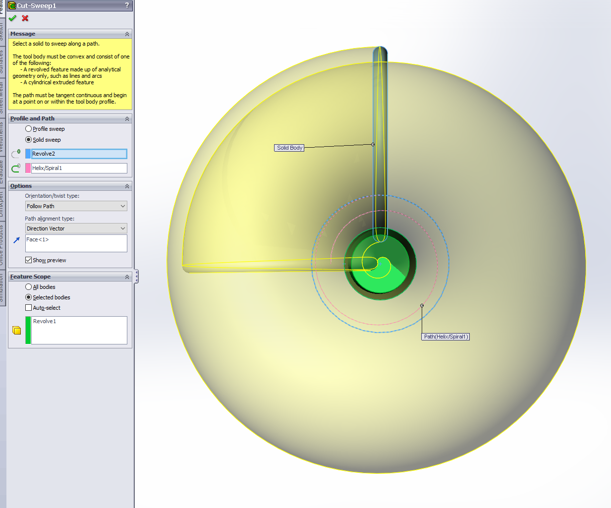 V inventoru bez problému. Po vymodelování frézy se musí udělat rovina na normále k šroubovici. Na tu se promítne řez frézou. To zaručí správnou geometrii při řezu. Pak už se jen táhne tvar po šroubovici a odebere materiál.