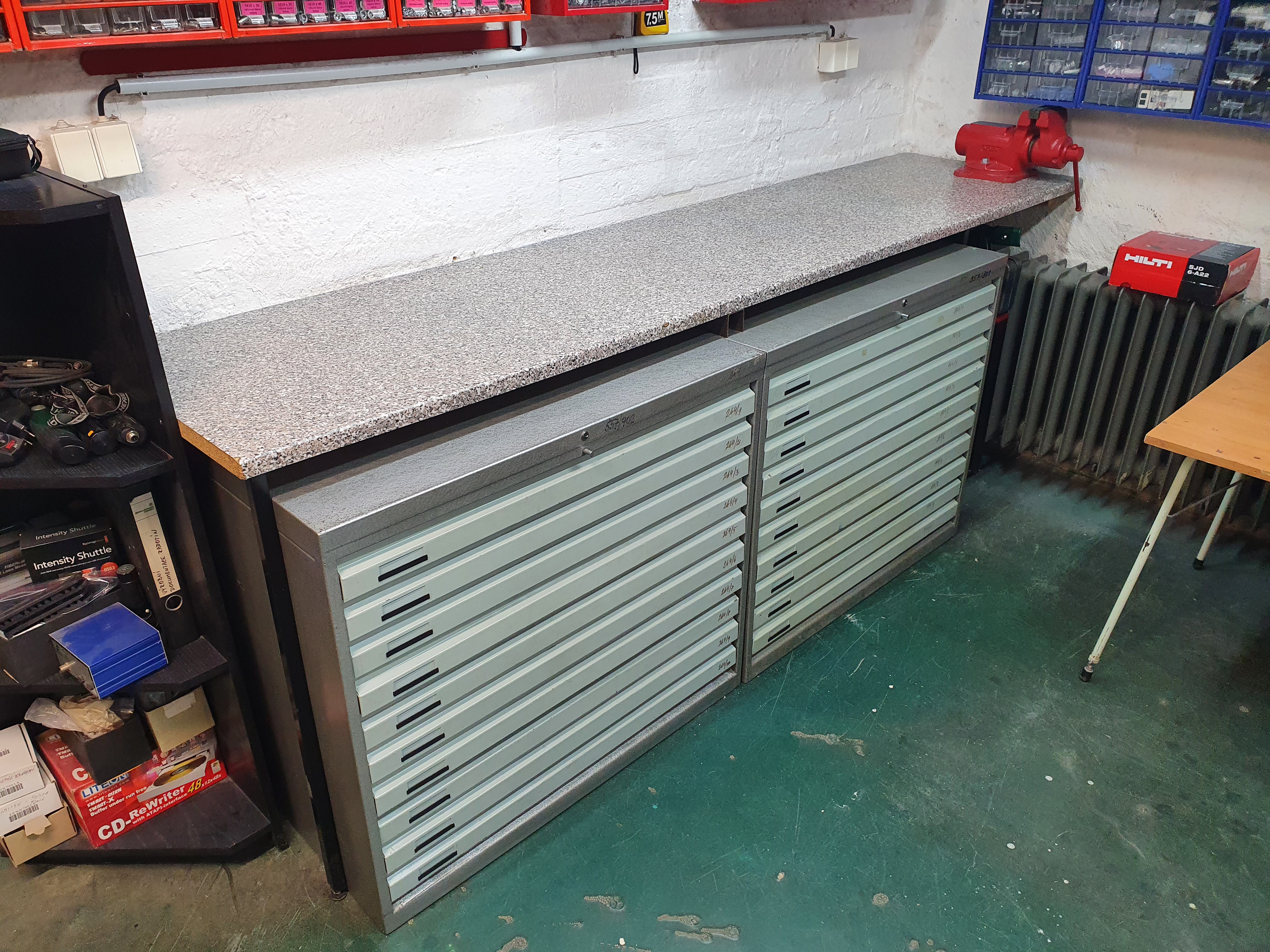 Nevyráběl jste si někdo takovéto šuplíkové skříně sám popř. v kooperaci? Asi by neměl být problém nechat vypálit a naohraňovat šuplíky, ty potom v rozích tigem svařit a dát na komaxit i s korpusy. Nábytkářských celovýsuvů je na netu nepřeberné množství. Určitě by to dopadlo líp než od Poláka a dalo by se to přizpůsobit přesně prostoru v dílně.