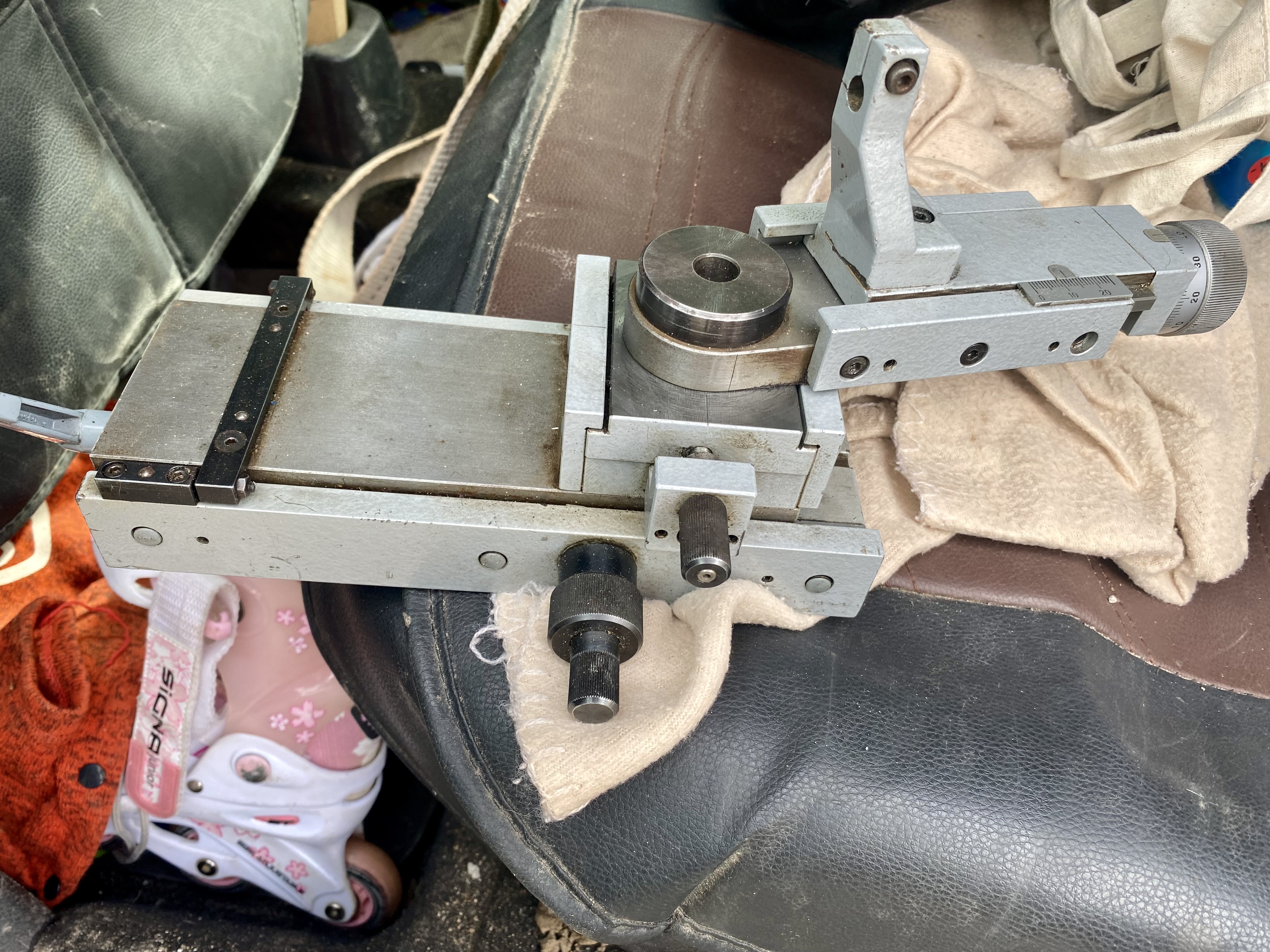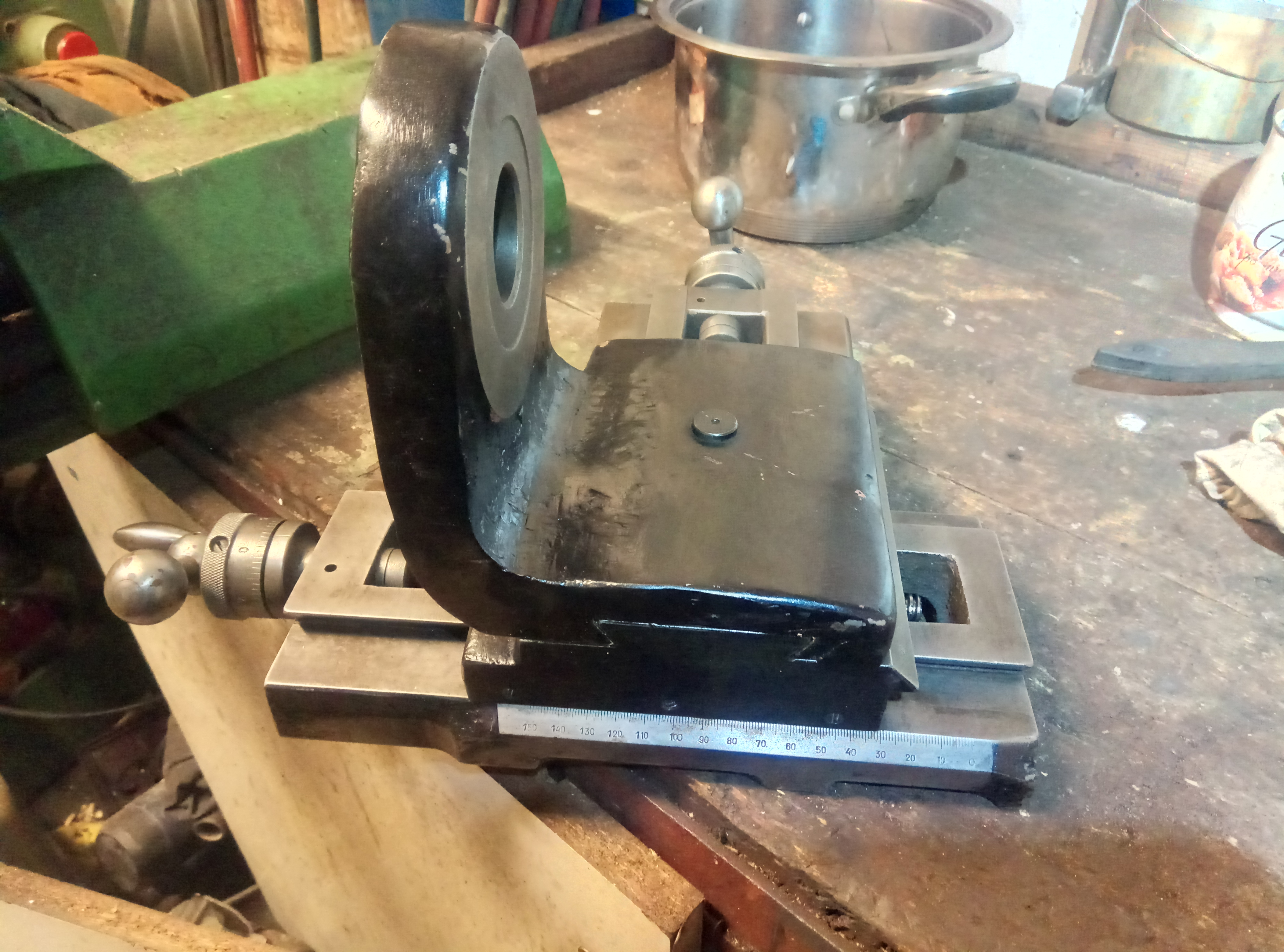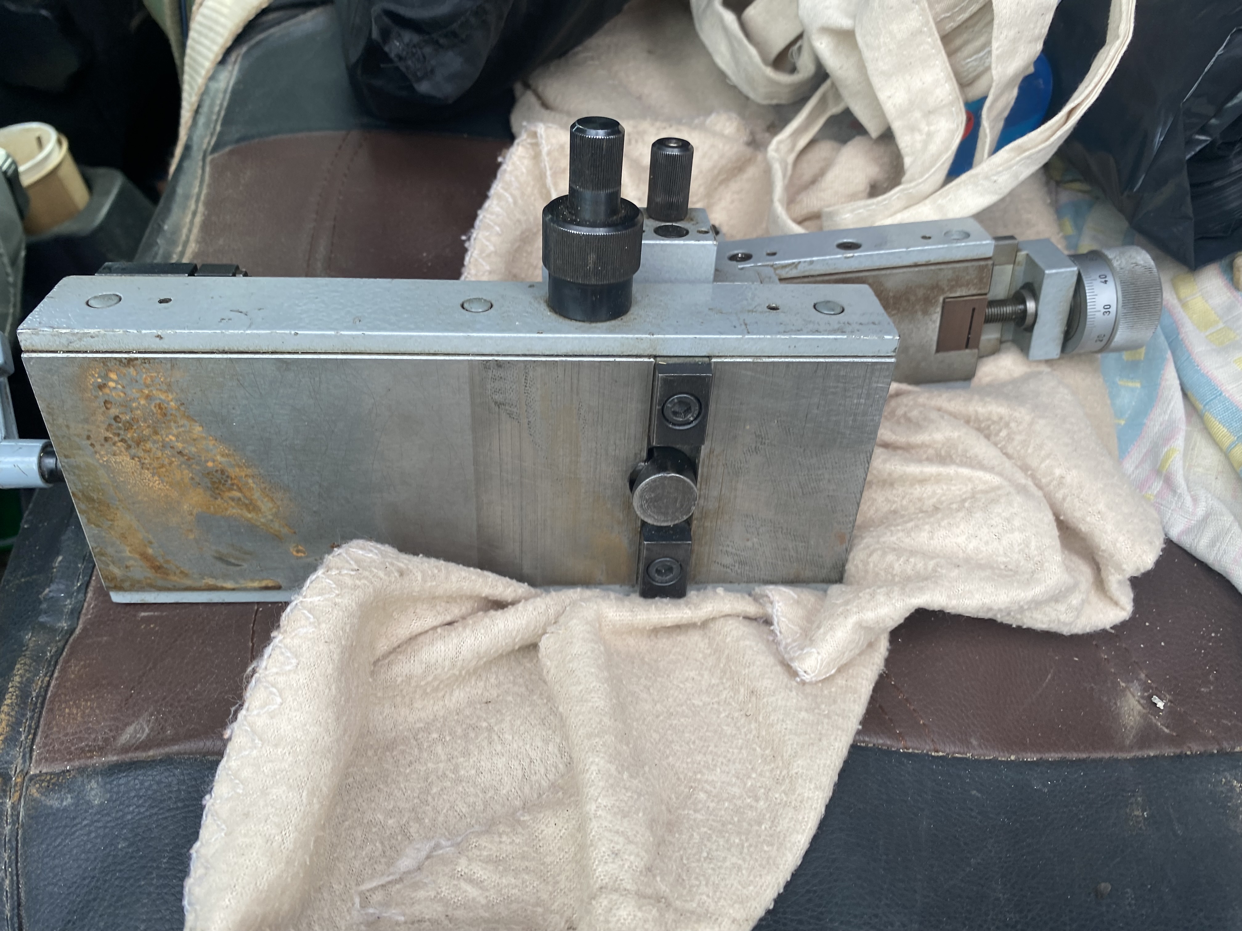 Vie niekto povedať z čoho to je_? Netreba po tom pátrať, teké dôležité to pre mňa nie je, len keď to niekto spozná. špekulujem, že to použijem na môj revolver. Len je to nejako všeliako obrátene všetko. nijak mi to nepasuje , ako keby to bolo pre ľavákov.Asi to je na nejakú brúsku. posun na 1 otáčku kľuky je 3 mm /hore aj dole/ dolný posuv číslovaný 0-150 horné vedenie 70-0-70.