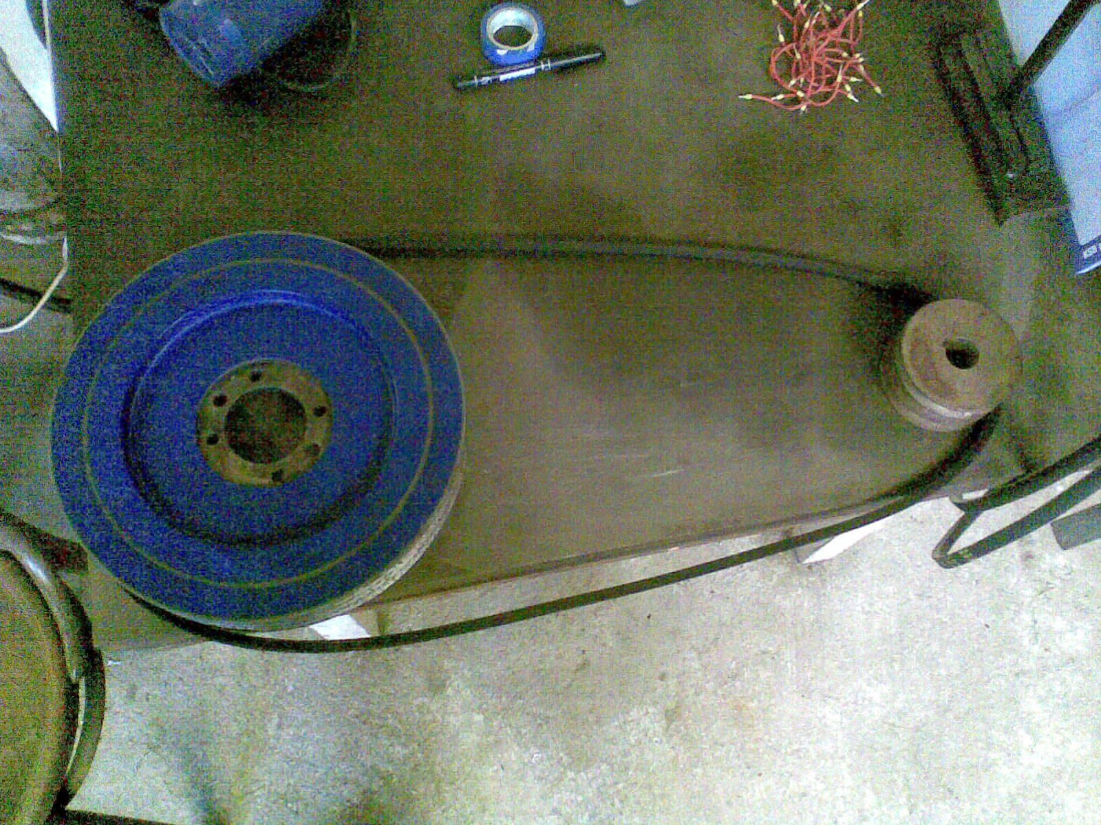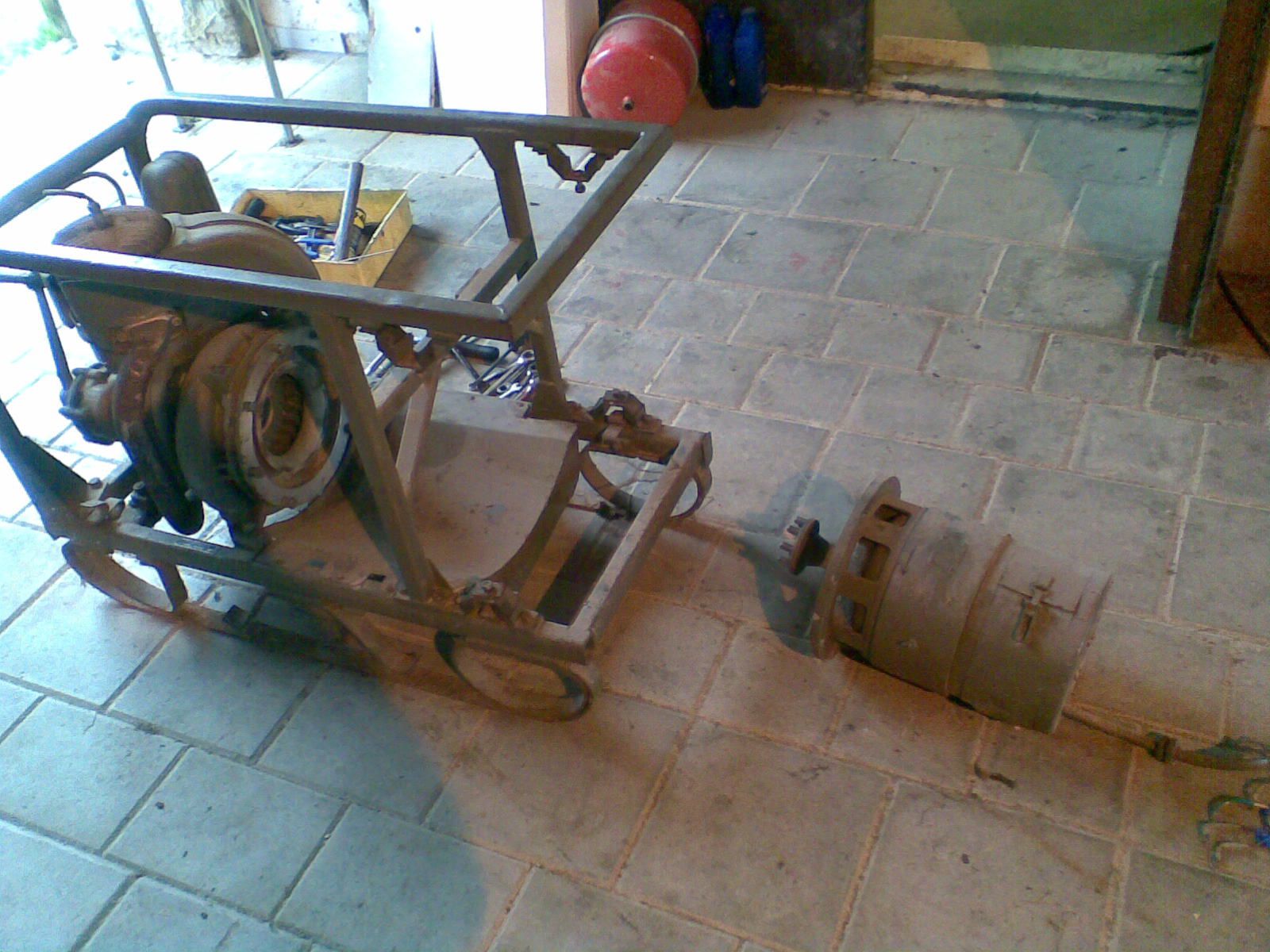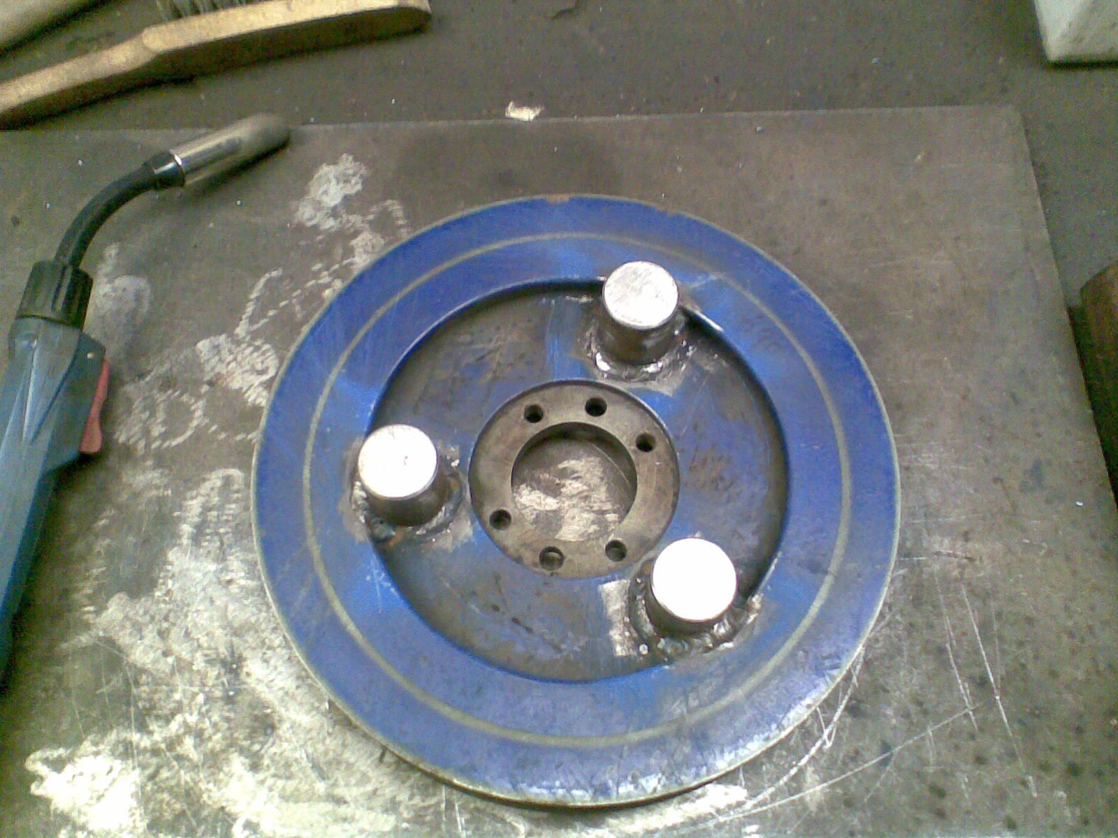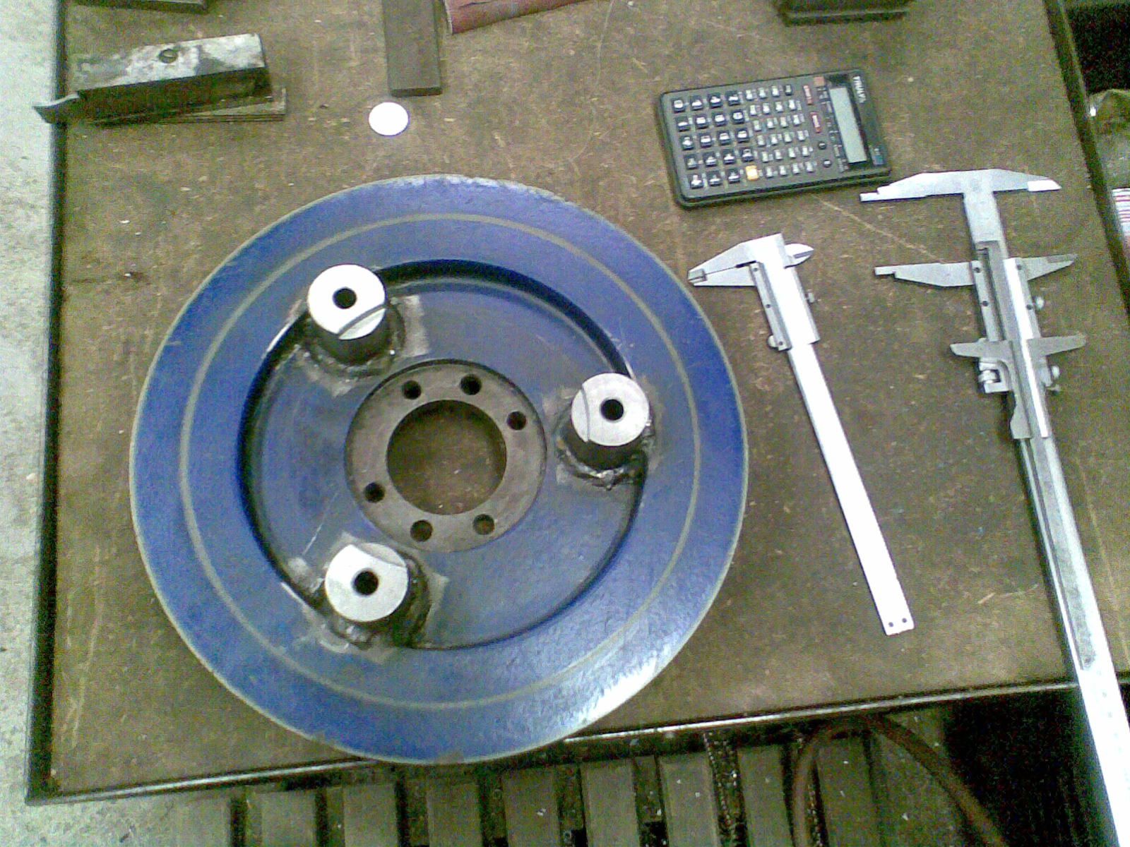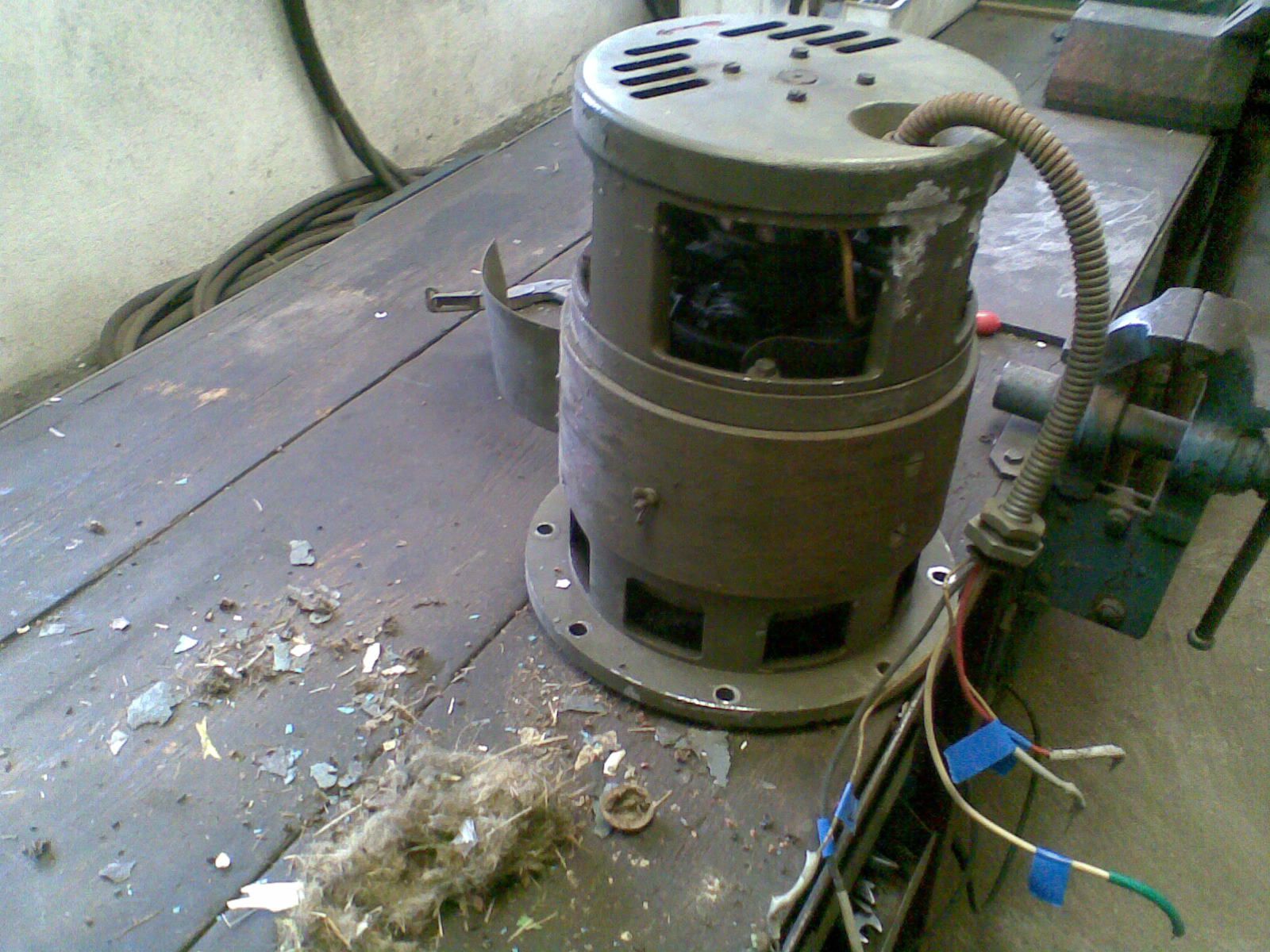 Generátor je vymontovaný, ale bude to trošku ořech. Je samosřejmě v přírubovém provedení (což jsme věděli) a leze z něj krátká kuželová hřídelka. Navíc v něm evidentně bydlely myši, které sežraly izolaci kabelů. Divím se, že mi to při zkoušení nevyhořelo. S velkou řemenicí na stabilák to taky nebude až tak jednoduché, budou se do ní muset přivařit jakési sloupky pr. 40mm, do kterých se na soustruhu udělá osazení, které zapadne do zámků na setrvačníku stabiláku. Zárověn jimi budou procházet šrouby.