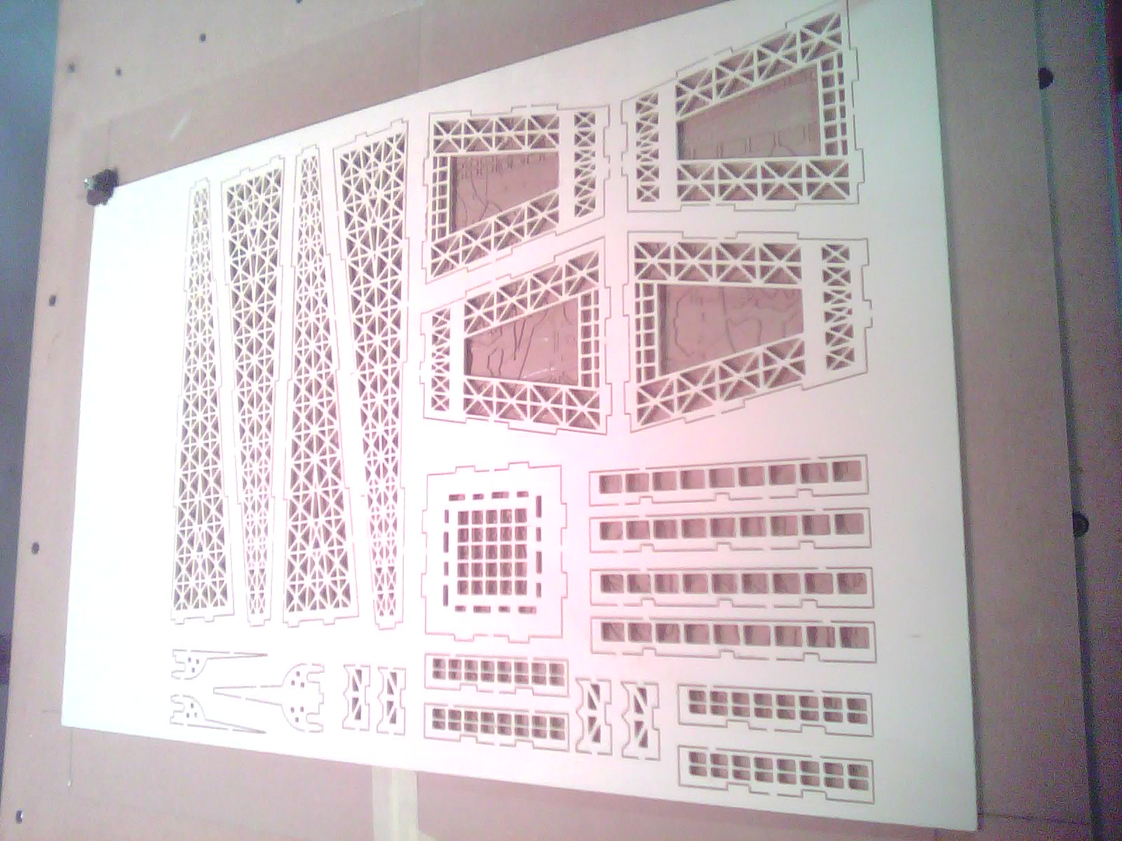 Tak frezka uz je konečne vo fukčnom stave, osadená mdf doska zo spodu stolarske matky, a ako prvy pokus bola eiffelovka generovane cez cut2d frezka 0.8mm rychlost som dal iba na 500mm/m bal som sa viac nemam este odskušane rychlosti aby som neulomil frezku, inak volny pohyb na X a Y zvláda freza 4000mm/m ale zatial to mam nastavene na 2400mm/m neskor určite pridam a je to bez rezonancii.