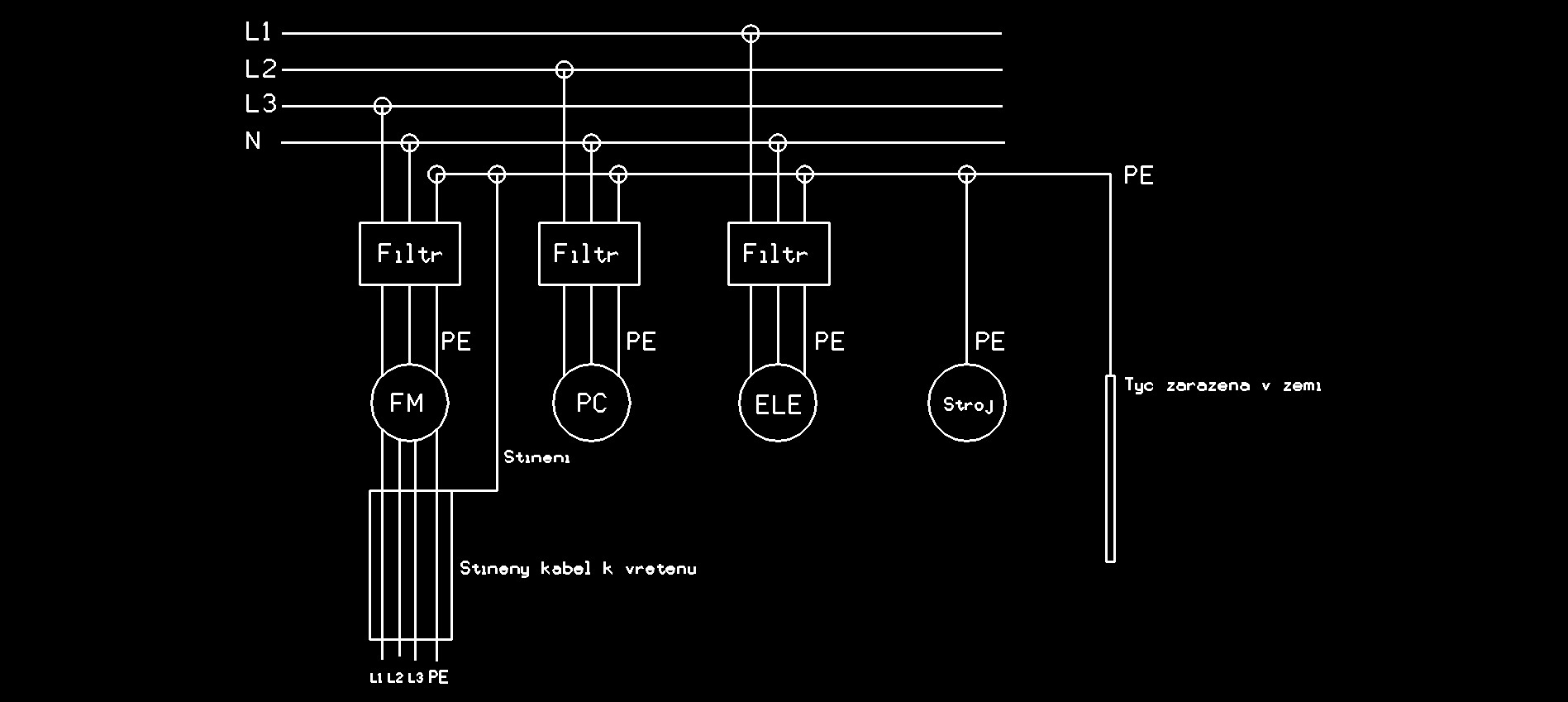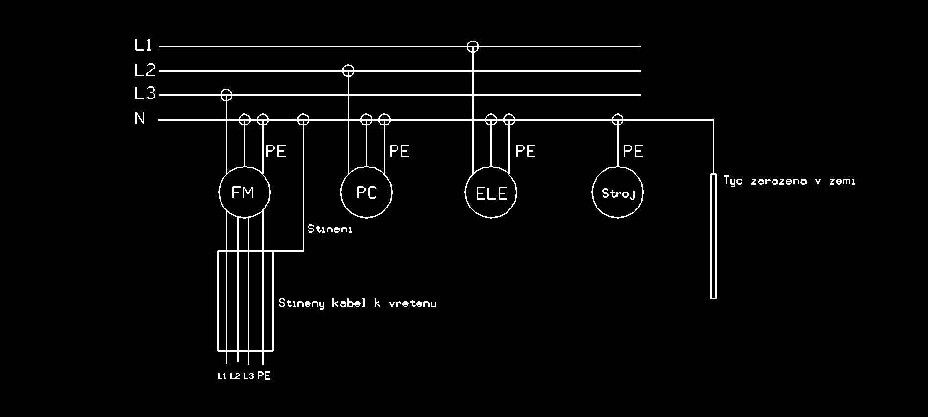 Tak to máš ještě postaru, je to tvz. ochrana nulováním. Osobně mi to přijde dost divný řešení, když vadaska na nulovém vodiči někdy žhne. U mne bylo tohle řešeno v rd. při rekonstrukci zatlučením dvaapůlmetrové pozinkované 2" trubky a připojení k zemnícímu rozvodu. Pokud by se ti ten problém opakoval, a plasty při obrábění skutečně generují statické el. docala dost, zkus ještě popropojovat vodičem jednotlivé pohyblivé části stroje.