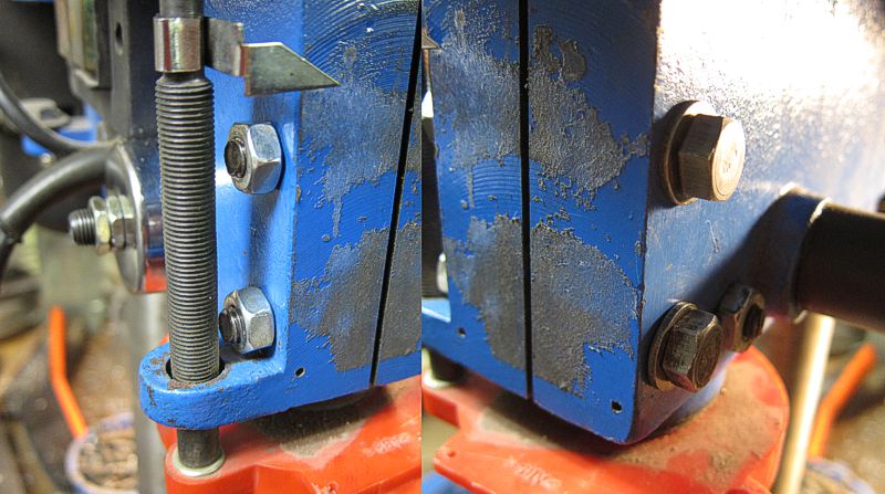 Já dneska řešil, jako už mnoho z vás, vůli na vřetenu čínské vrtačky co se maskovala za názvem GÜDE. Rozřízl jsem část těla vrtačky, na levé části vyříznul závit M8 a celé to stáhl do „bezvůlového“ stavu šrouby s kontramatkou.
