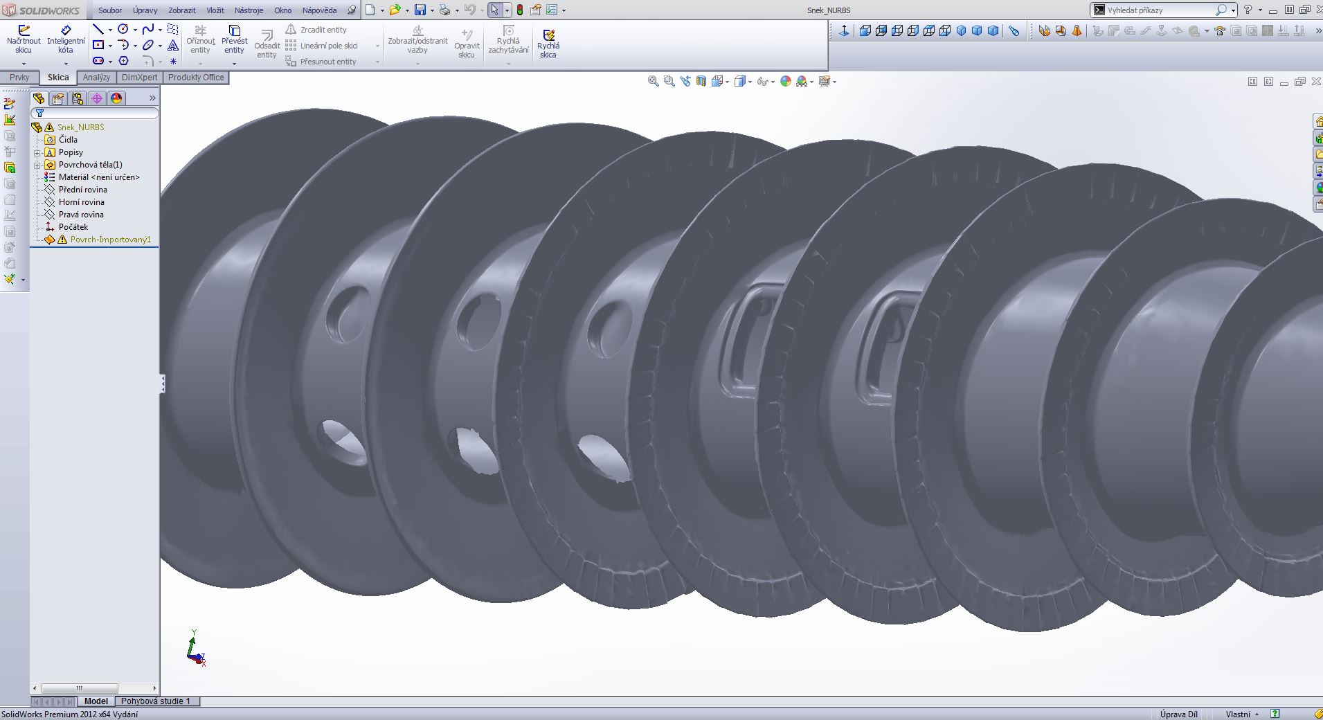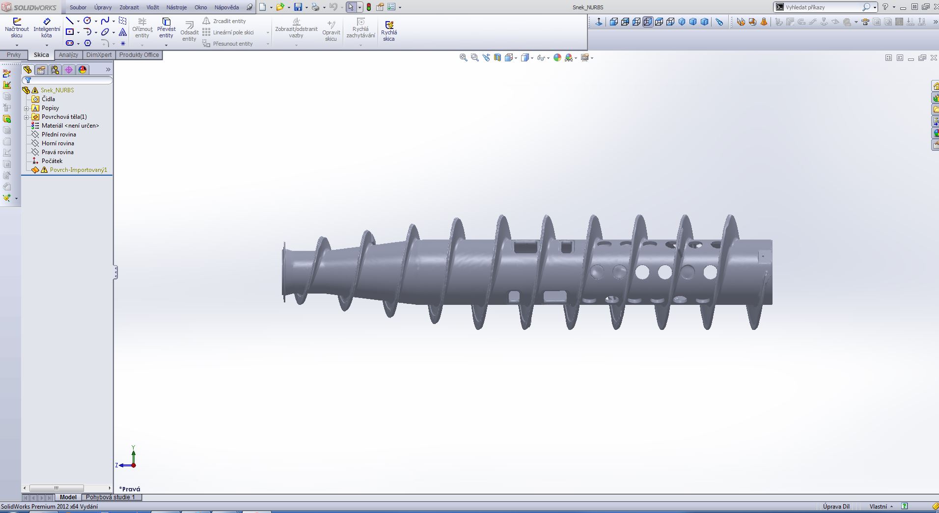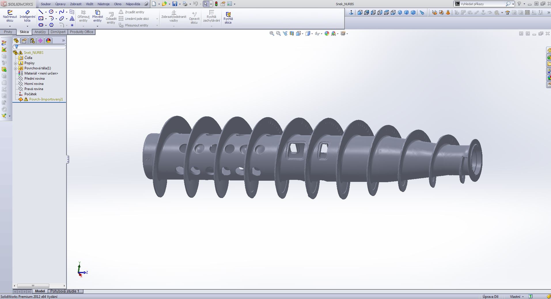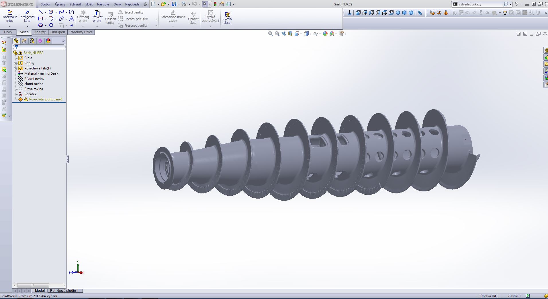 Je to šnek z tzv. trikantační odstředivky a jedná se o kótovaný výkres šnekovnice pro účely pozdější renovace. Tzn. jde hlavně o průměry, délky a sklon jednotlivých závitů. Přibližné rozměry viz. obrázek.