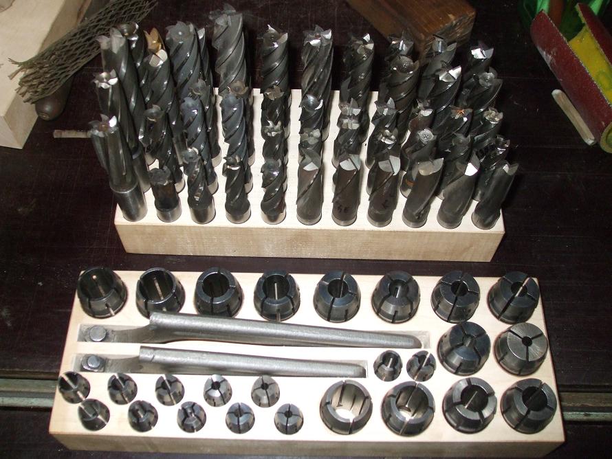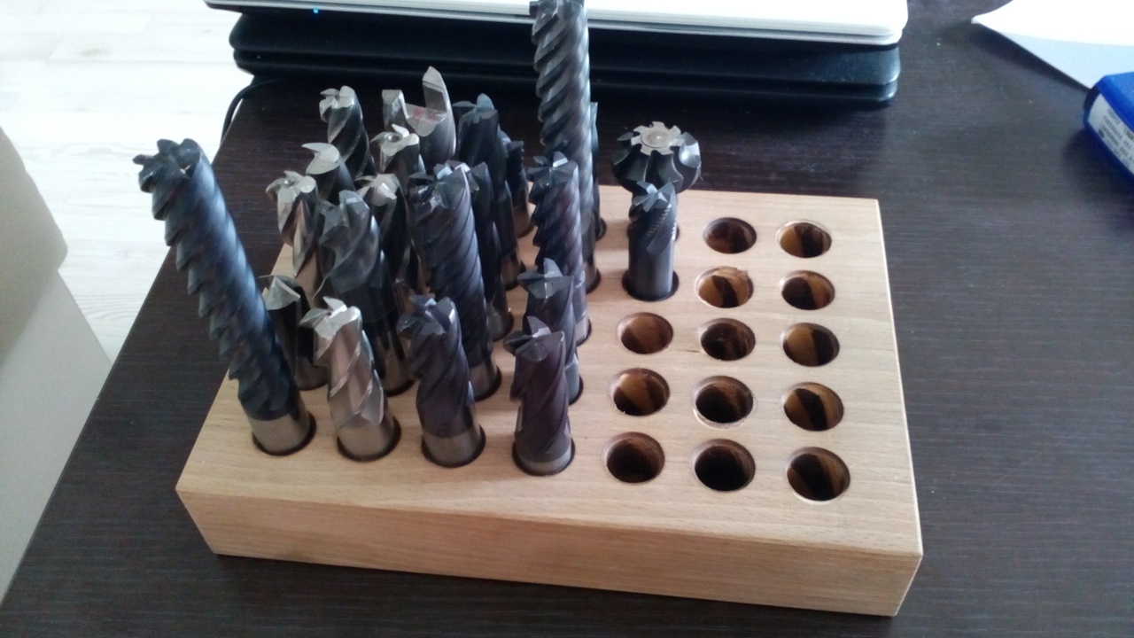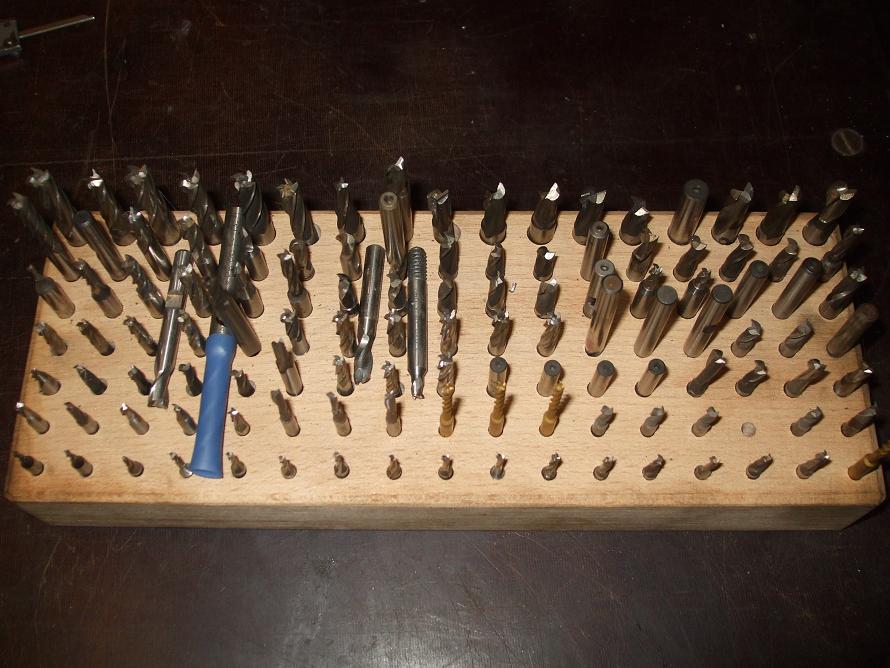 frézy a frézovací nástroje mám v takovém velkém šuplíkovém stole uvnitř plastové prolisované plata s miskama a frézy některé v origo krabičkách a některé na sobě položené neni to sice vůbec strojařské ale já s tím po sobě nemlátím a nikdo jiný na to nesmí šáhnout nebylo by špatné udělat podobné stojánky jenže nemám celé sady průměrů a naopak mám třeba 10 ks jednoho průměru a celkem je toho asi 400kg tak bych měl všude monžě stojánky a stejně bych to neměl kam dát...ale když jedu někde něco montovat mám klasické sady v plechových krabičkách vrtáky záhlubníky, závitníky a stupňovité vrtáky to je dobré aby toto všechno bylo v obalu a vždy po ruce mrknutím oka vím, že nic nechybí