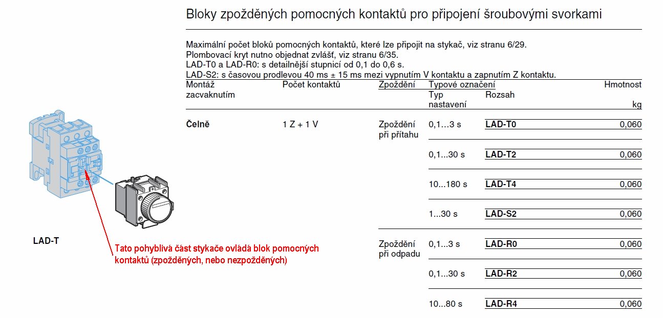 Samozřejmě poznávám, že ten element je blok přídavných zpožděných pomocných kontaktů. Není to časové relé v pravém slova smyslu, protože vlastní zpožďování kontaktů způsobuje pneumatický mechanismus, který je uvnitř toho bloku. Blok, který nemá vlastní ovládací cívku, se připevňuje na stykač a pro pohon pneumatického časového mechanismu se využívá pohybu hlavních kontaktů stykače, na kterém je blok nasazen.brutal píše:jjJeště přikládám obrázek elementu, u kterého jsem vůbec nevěděl k čemu je, nepoznává to někdo?