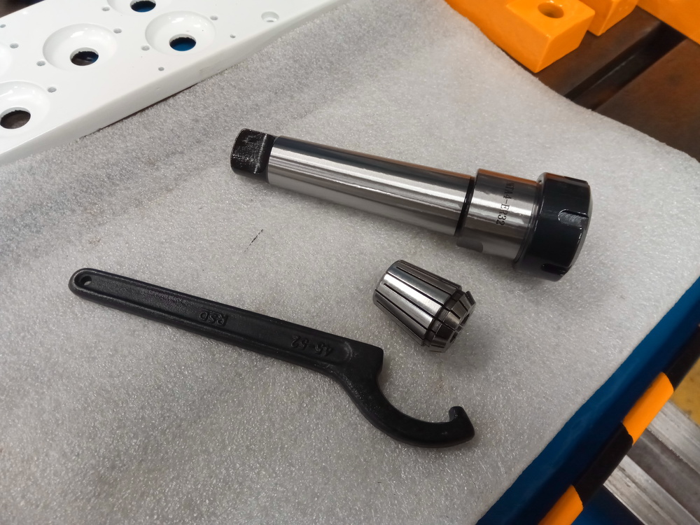 Kleština vypadá bezchybně, zpracování se mi líbí. Klíč jsem vzal o číslo menší, sice v popiscích u ER 32 mají tento rozměr, ale klidně by mu slušel o číslo větší. Není to na závadu, vemu jej příště. Samotný držák vypadá dobře zpracovaný, všechno broušený. Problém jsem našel u matice, nevím za jakýho důvodu tam nechali ten kroužek, a ještě jej zvládli udělat mimo osu. Na měření už dneska nebyl čas, třeba zejtra to hodím do vřetena a zkusím s tím zatočit, jestli to jede v nějaký rovině.