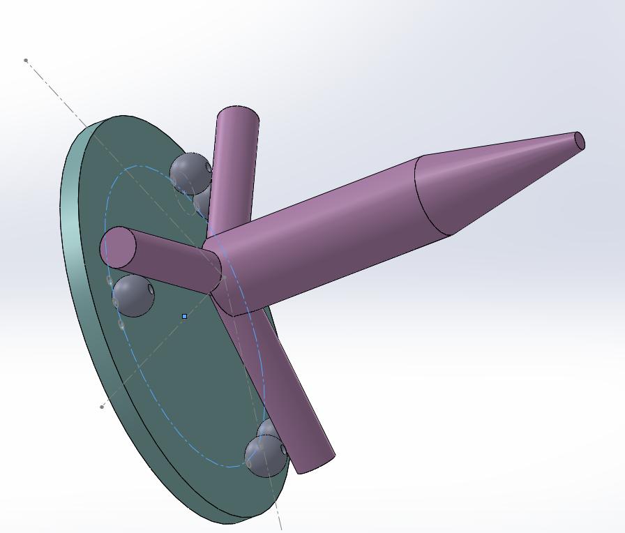 dva čepy + 4 kuličky - stále mohu kývat a stále mohu pohybovat do boku = pootáčet tykadlo - střed tykadla se posune, ale vždy najdu pozici, kdy se budu dotýkat všech 4 kuliček.