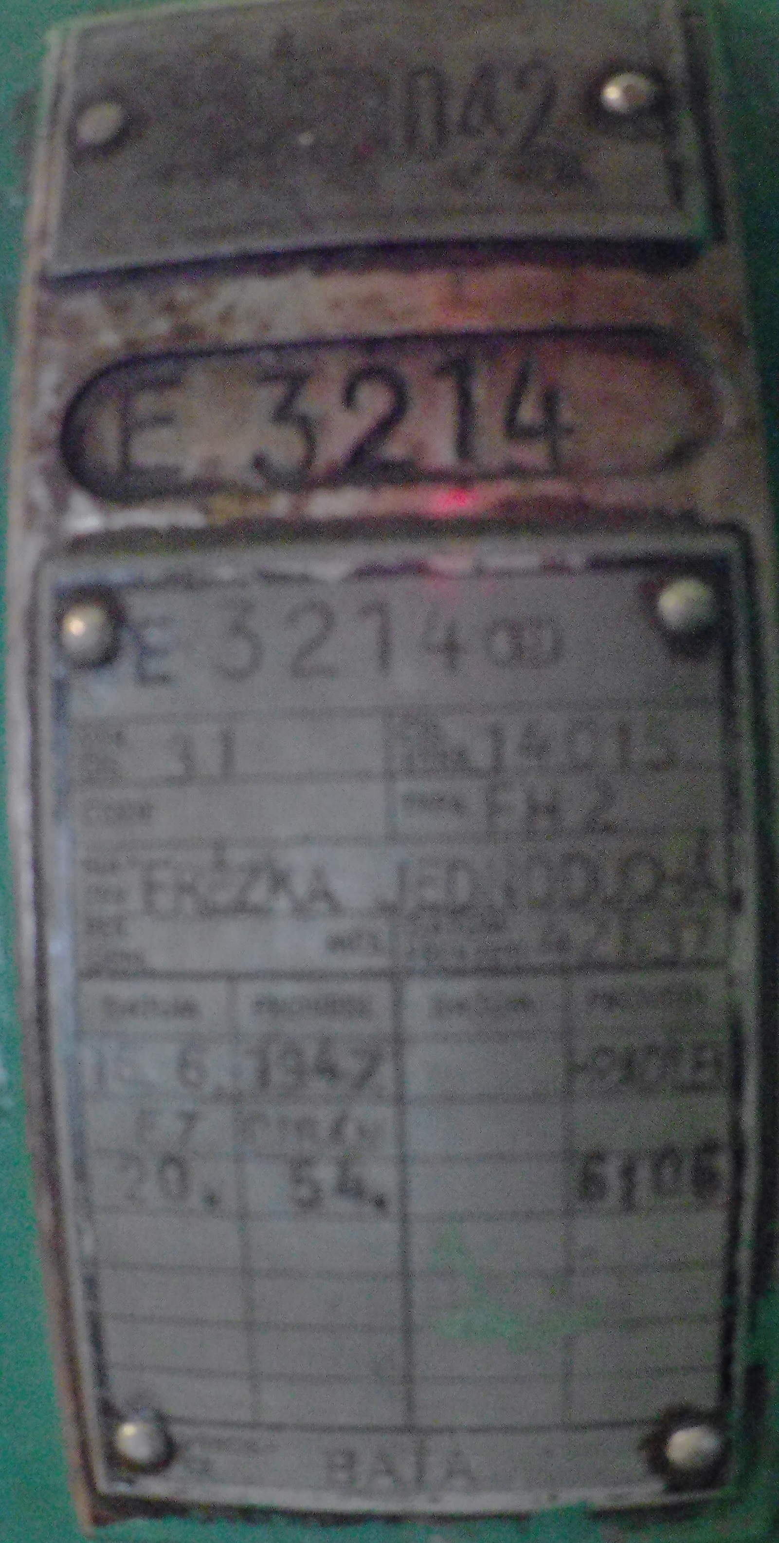 Tak jsem ji dnes vyfotil a dávám fotečky. Všiml jsem si, že na štítku je ještě vyraženo BAŤA, takže asi bude vyrobená někdy ve okolo roku 1940 +-. 1947 tam je první generálka a druhá (poslední zapsaná je) 1954.