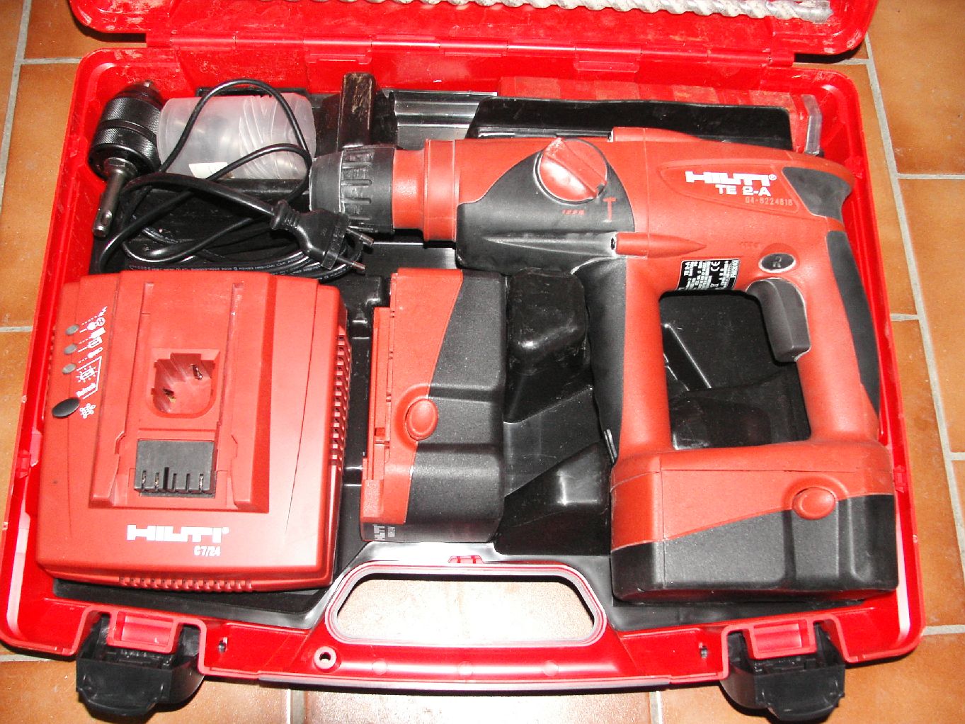 Baterky jsou 2ks, 24V, 3Ah, NiMh. Na jedno nabití cca 100 děr pr. 6mm do cihly a betonu do hloubky cca 60mm.