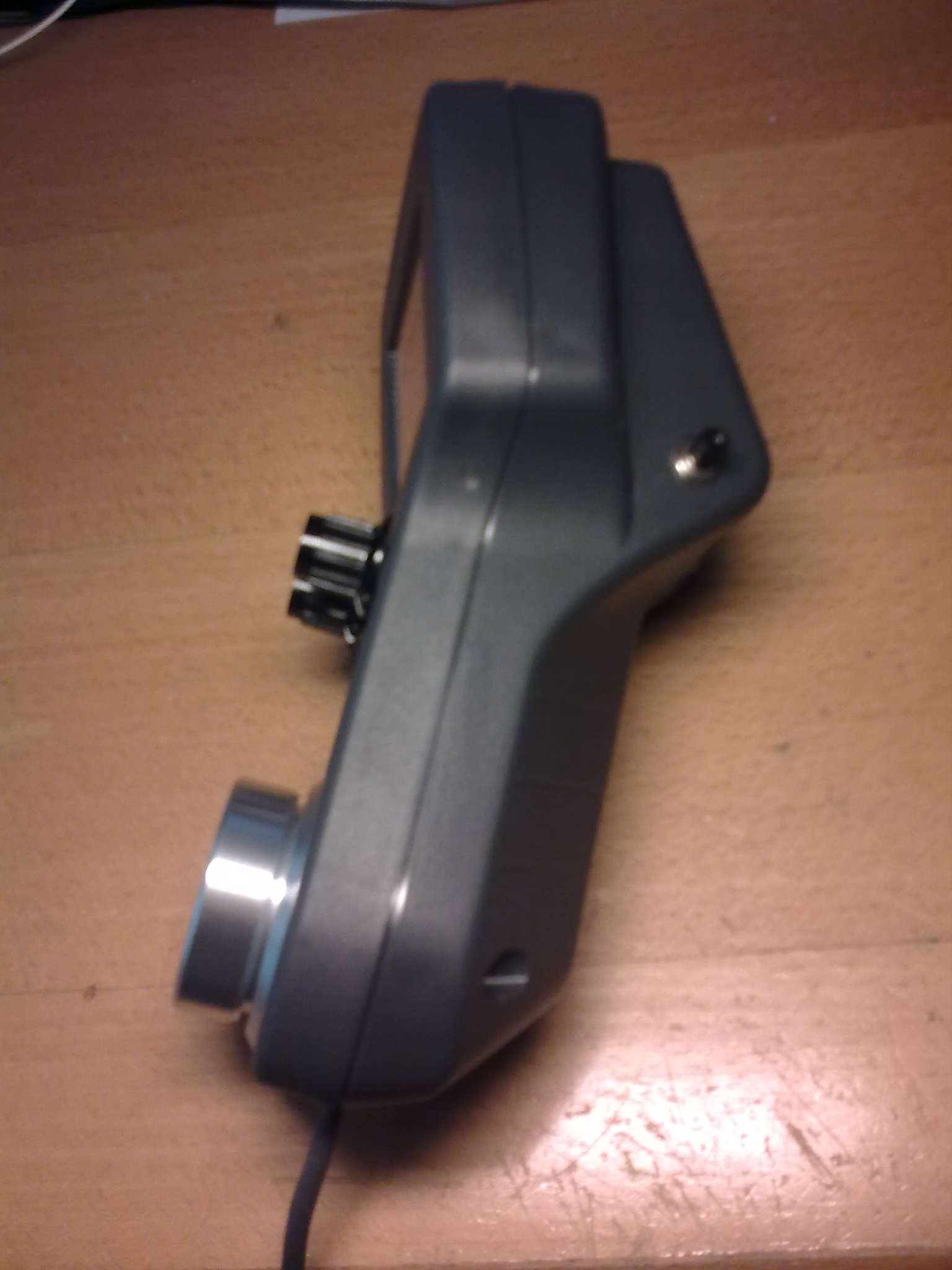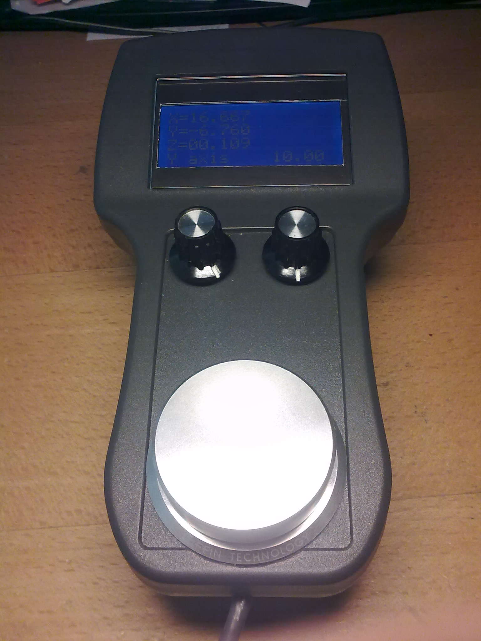 Jako joggovací kolečko jsem použil rozbitý Griffin Technology PowerMate, kterej sem trochu upravil na soustruhu, aby nebyl tak vysokej. Uvnitř je mechanický encoder a funguje spolehlivě. Jinak sem koukal u Conrada, že je maj a udelat si na to kolečko snad zvádle každej.