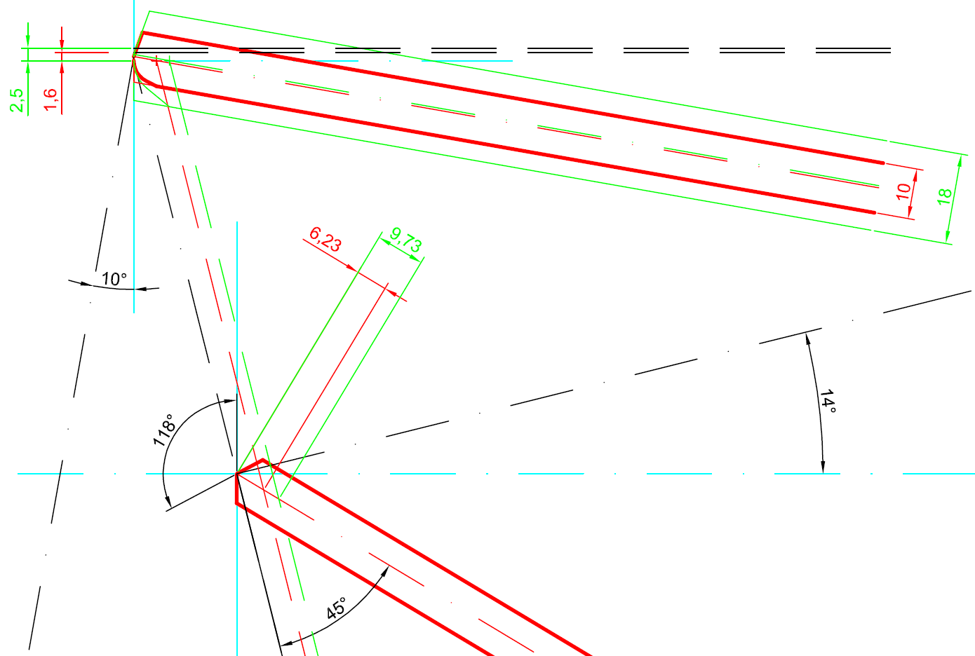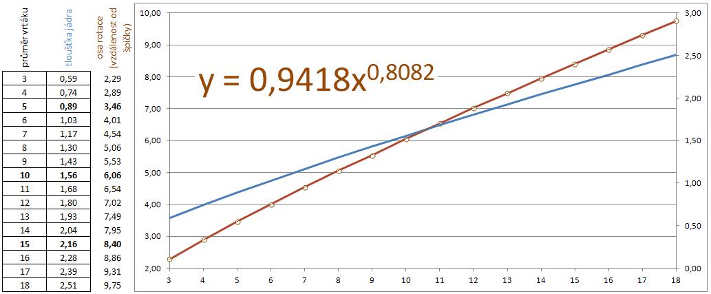 Příklad pro vrták průměr 10 a 18, kdy jsem zvolil délku hřbetu stejnou jako tloušťku jádra (správně by to asi měla být polovina, ale nejsem si jist, zda je přípravek tak promyšlený, aby "podroušení" nesprasilo druhý nebroušený hlavní břit)