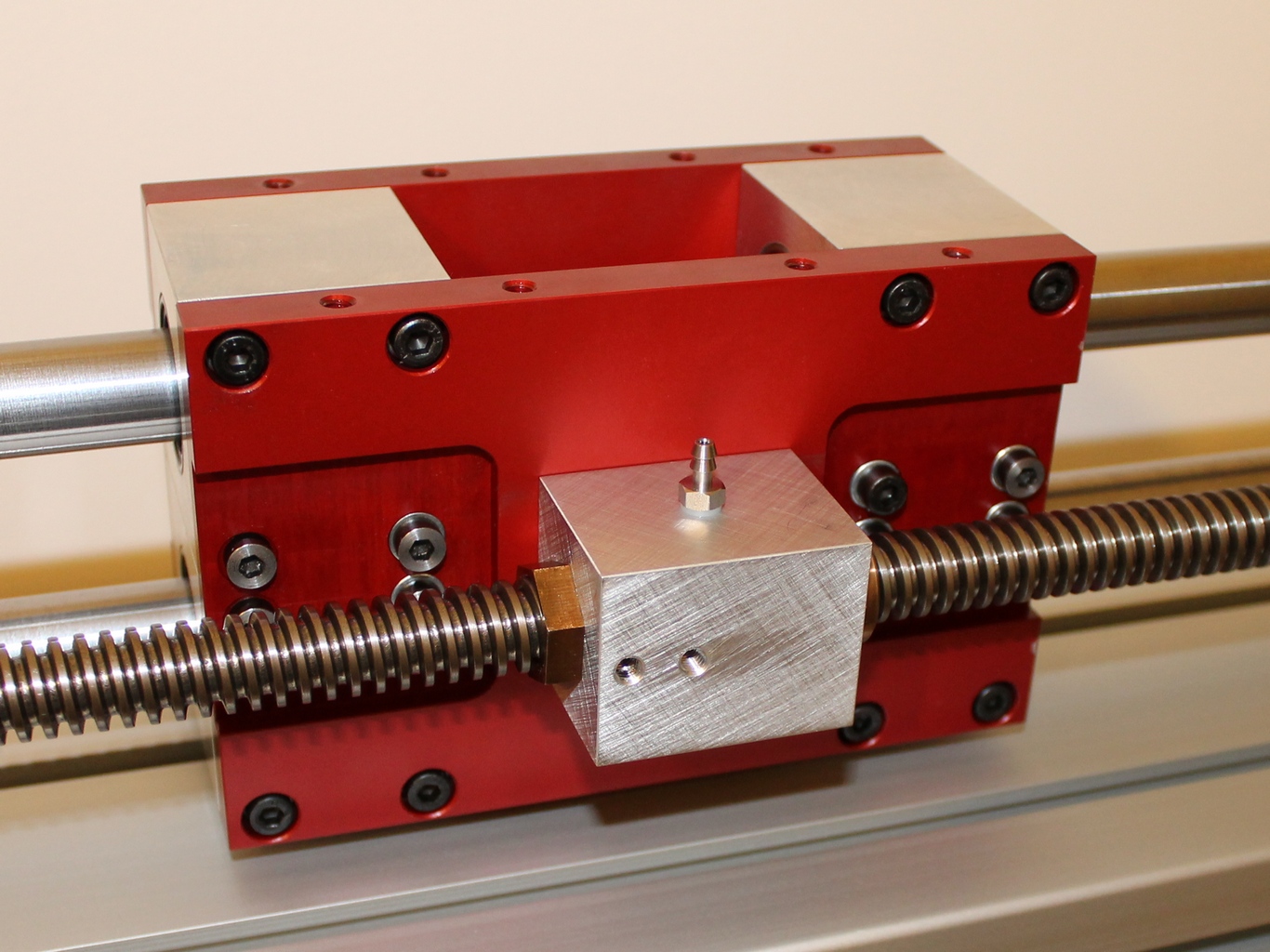 Detail vozíku osy X + mazání bronzové matice s vymezenou vůlí (backlash něco málo přes setinu mm)