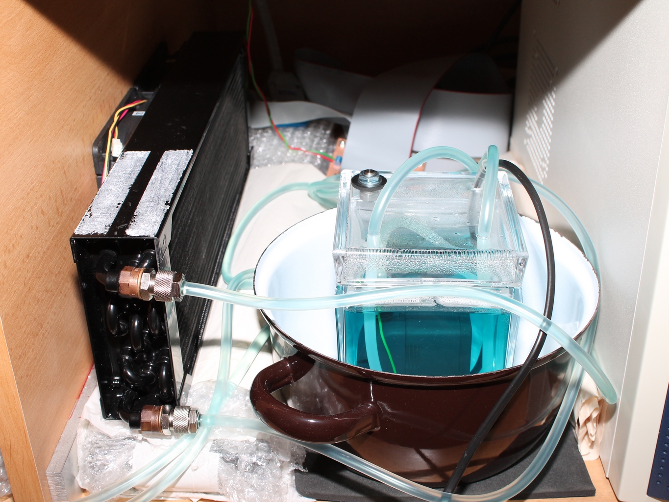Dočasné řešení chlazení "vodníka" (výmněník na 3ks 120mm ventilátorů - bohatě zatím stačí dva se sníženými otáčkami) Čerpadlo Eheim na 230VAC - chladící kapalina jako na chlazení PC komponent - antikorozní, antibakteriální atd....)