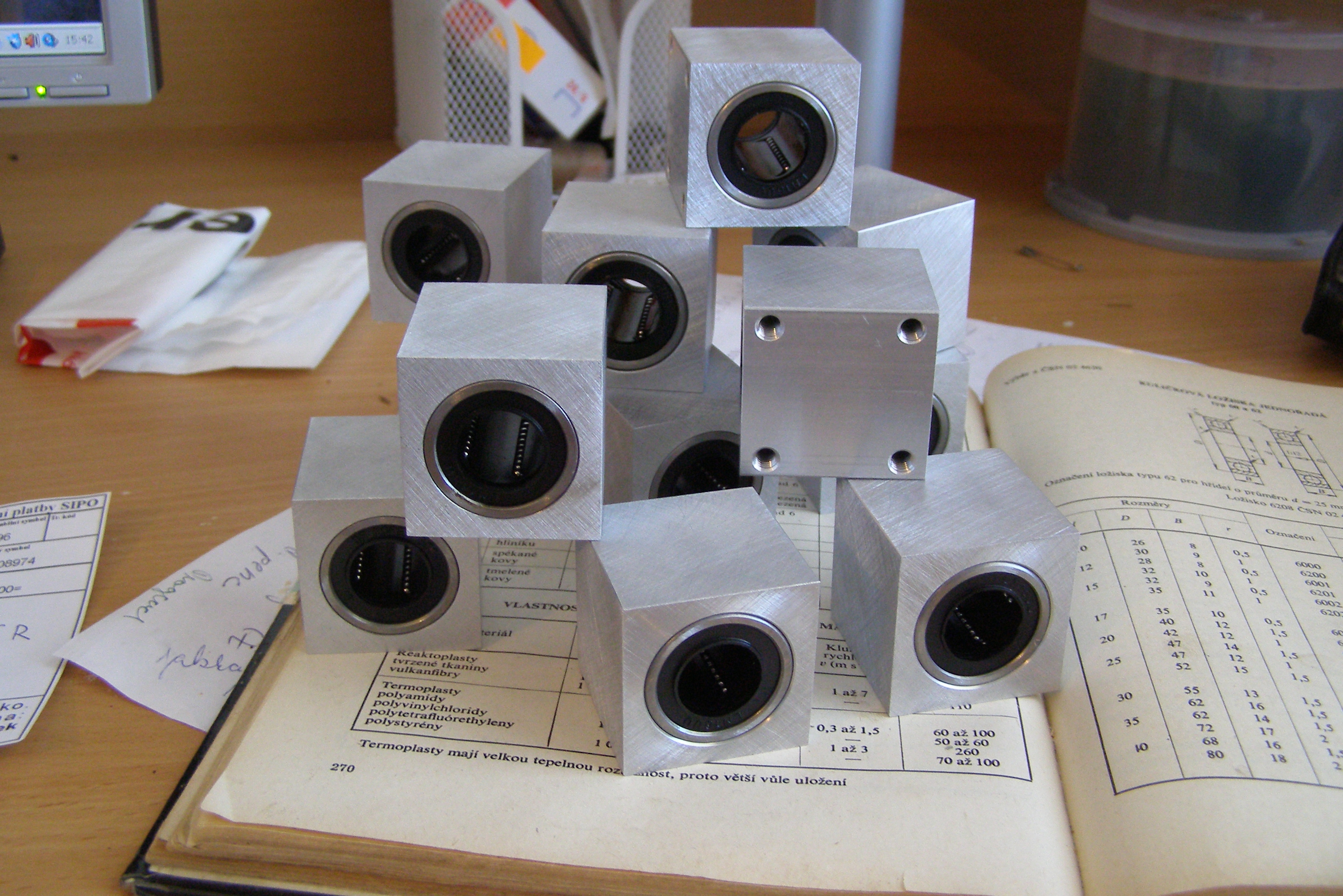 Víš, to byl od něho jen takový kup 2ks na skoušku, přece jenom se jedná o díl(domeček s ložiskem o fí 20mm) v nejnišší cenové hladině, problém je že ale s vůlí už nic neuděláme, ono zase na druhou stranu pokud dílce na frézku nebudou vyráběné v setinových tolerancích a budou se při montáži různě dolícovávat a chytat se bude taky souosost, rovinnost atd, tak tam ta vůle asi bude potřebná, aby to vůbec nějak chodilo, ale moje zásada je dělat díly pokud možno s co největší přesností, a pak odpadavají různé problémy, nakonec jsme s kamošem, je to taky velmi aktivní člen fora, nemohu ho jmenovat, ale má nick CZ_Pascal, spolu vyrobili tyto domečky - material domečku AW-2017, rozměr 36x36x37, kuličkové pouzdro 16x28x37, otvor pro kuličkové pouzdro v domečku -0.03 až -0.035mm, no a po zalisovaní kuličkového pouzdra do domečku vůle mezi kuličkovým pouzdrem a tyčí prakticky tak 0.00mm je to až moc dobré,vůle tak +0.01mm by byla asi lepší, Bob