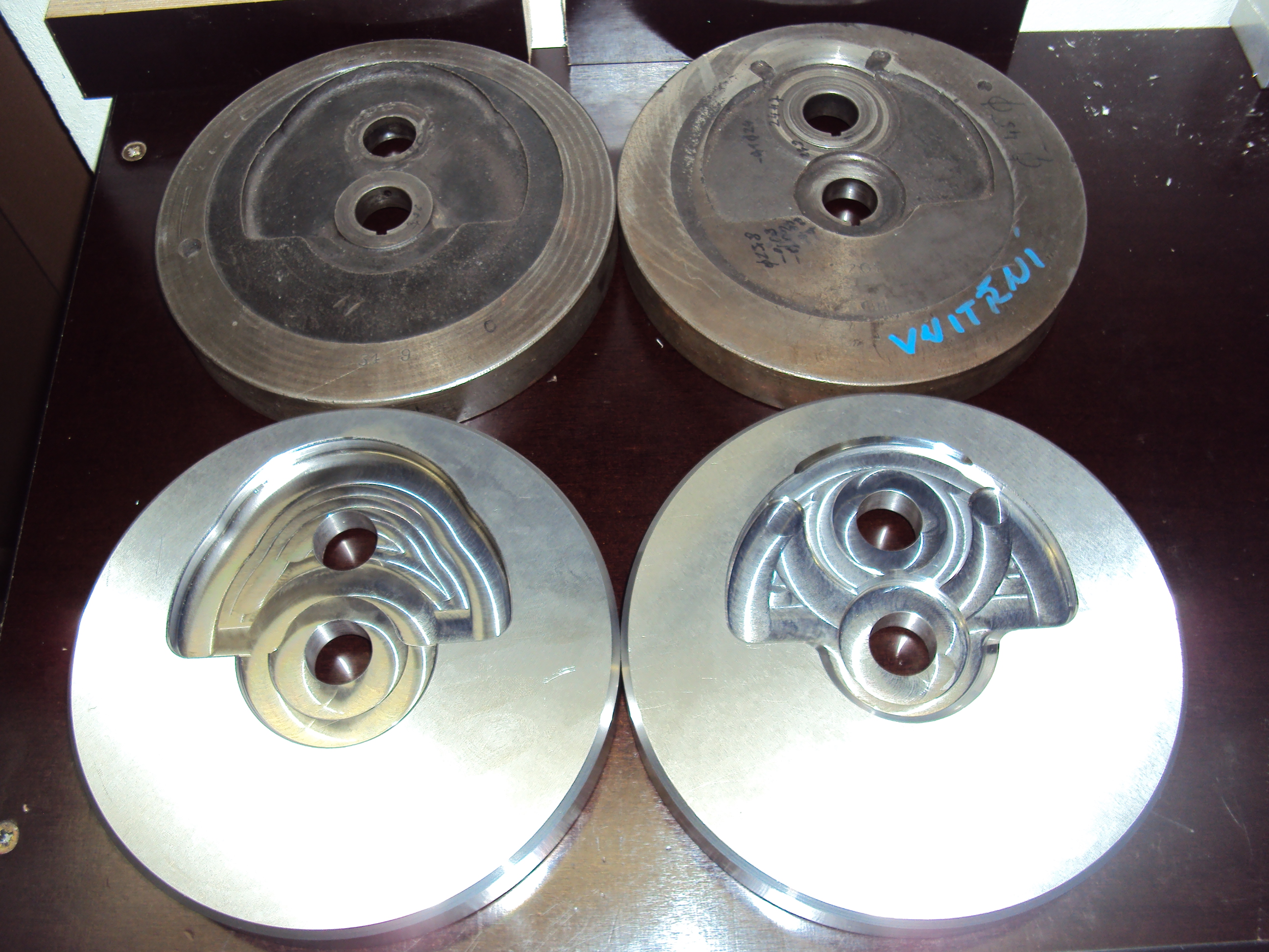 tak jedna fotka pro Tomíka, že i Ras umí dělat špony a ne jen kecat.. průměr cca 200mm,materiál ocel třídy 15, frézováno 16mm plátkovou frézou, nahoře původní poškozené kusy, dole pokus o kopii..
