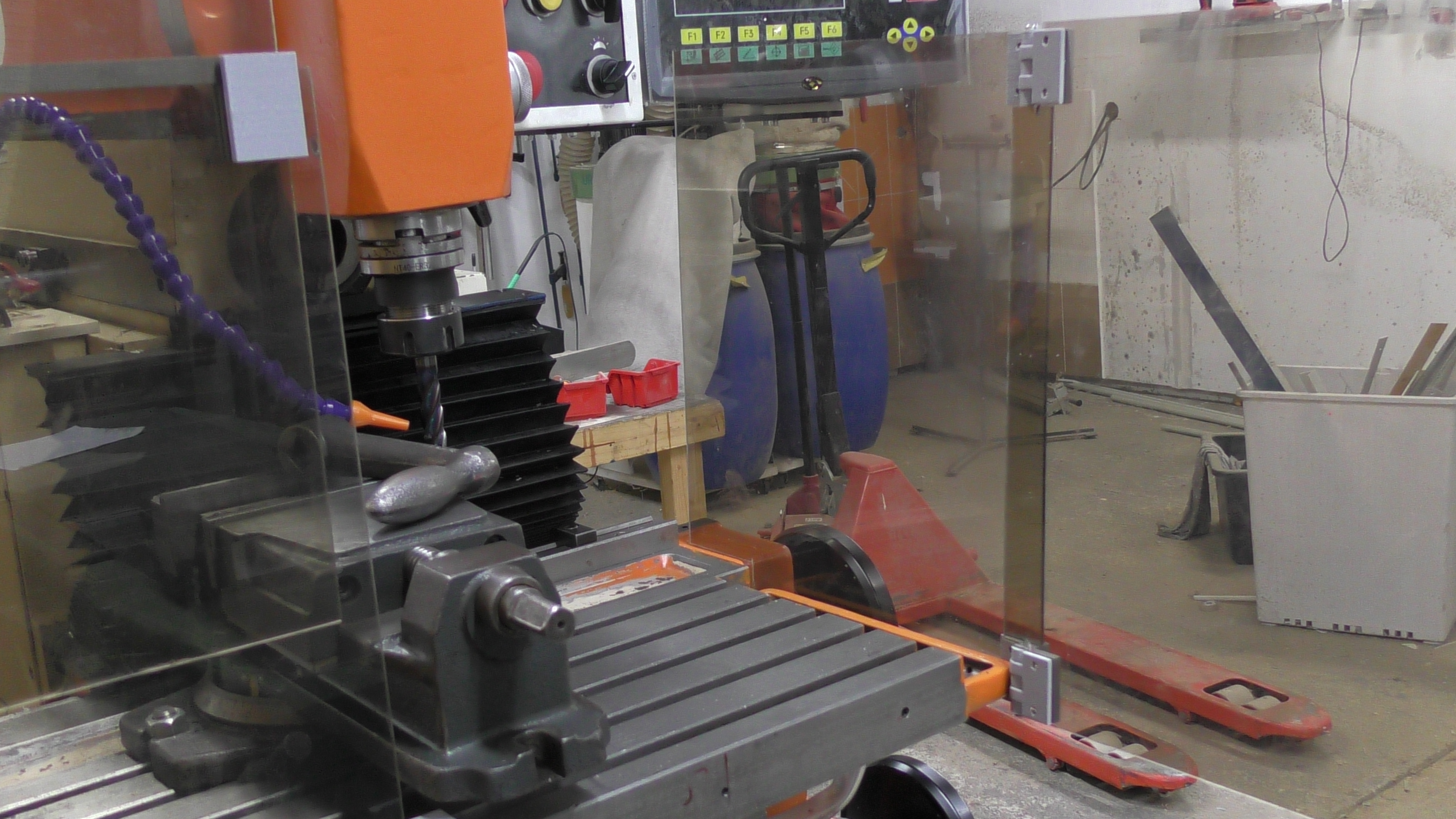 Tak zase kousek. Dodělal jsem štíty proti rozstřiku špon. Jsou snadno demontovatelné, střed je posuvný s možností otvoru pro svěrák, otevíratelná dvířka na pantech. Na frézce jsou napevno pouze postranní klipsy, do nichž se zasouvají bočnice. Montáž/demontáž kompletního zakrytování trvá méně než třicet vteřin. Kryty se dají na pantech složit a uložit snadno do police.