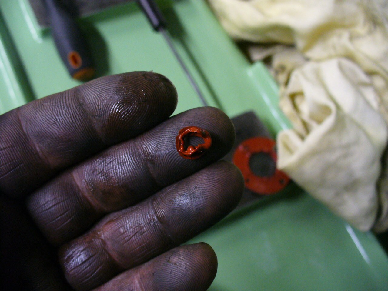 Olejoznaky jsou ve vrchní hlavě, kam ten olej přivádí trubka přes otvor (jde vidět na fotce) no a musíš to zatěsnit, já jsem byl pečlivej a část toho tmelu do toho otvoru vtekla, tady jsem to vyfotil když jsem to poprvé pustil, tak to natlakovalo, ty olejoznaky, párkrát jsem to vypl a asi po třetí čumím co z té trubičky v olejoznaku leze za šušeň, no bylo mě to jasný, tak jsem nadával, že to budu muset znovu rozdělat, ten tmel se dostal do olejoznaku, omylem jsem to zapl ještě jednou a ten kus normálně vletěl do toho spodního kanálu nad ložisko, zahnutým drátkem jsem ho po oddělání olejoznaku opatrně vytáhl jinak by ucpal to mazání ložiska ty dírky mají tak 4mm víc ne, takže futruje to ten olej pěkně :)