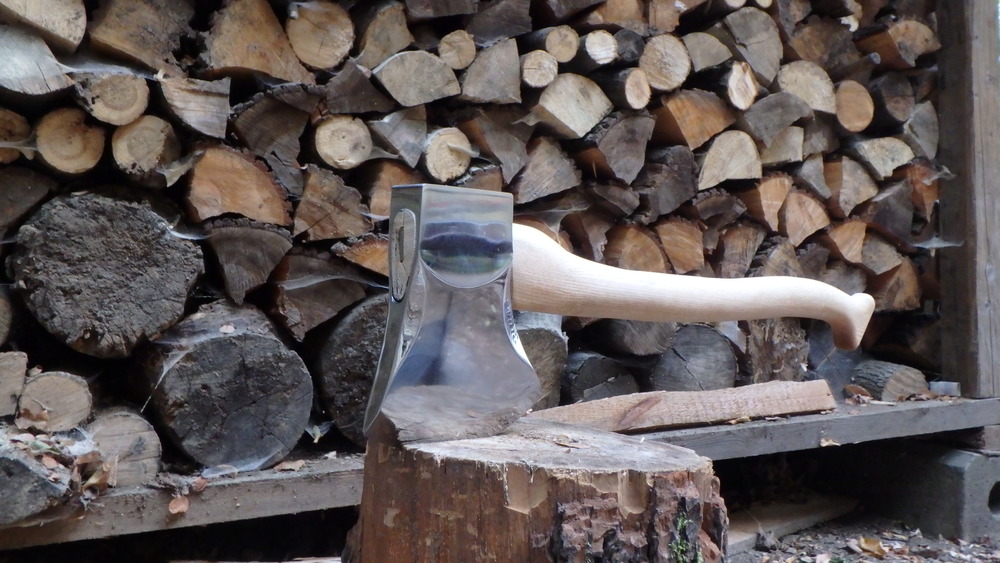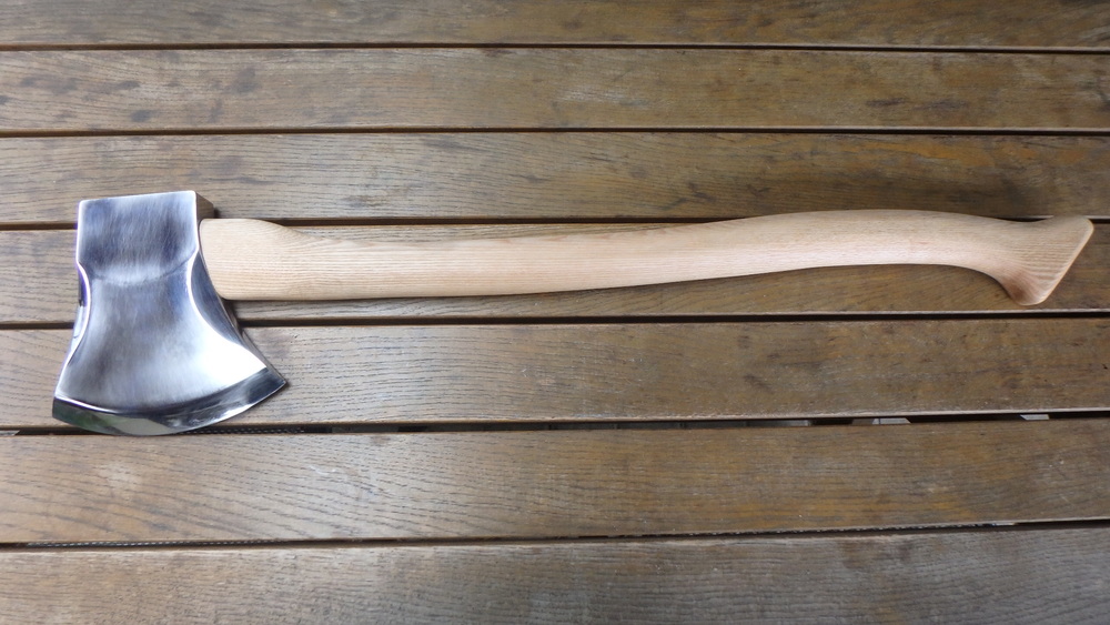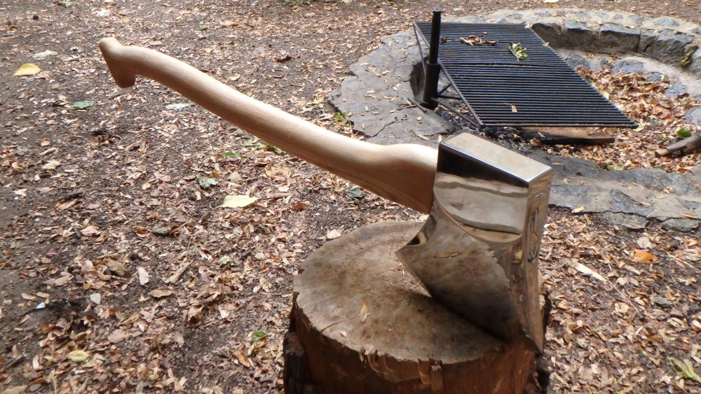 Sekera TUATAHI timbersport obráběno na 3osce Hyundai, ručně leštěno. Topůrko pilováno rašplí z dubové fošny.