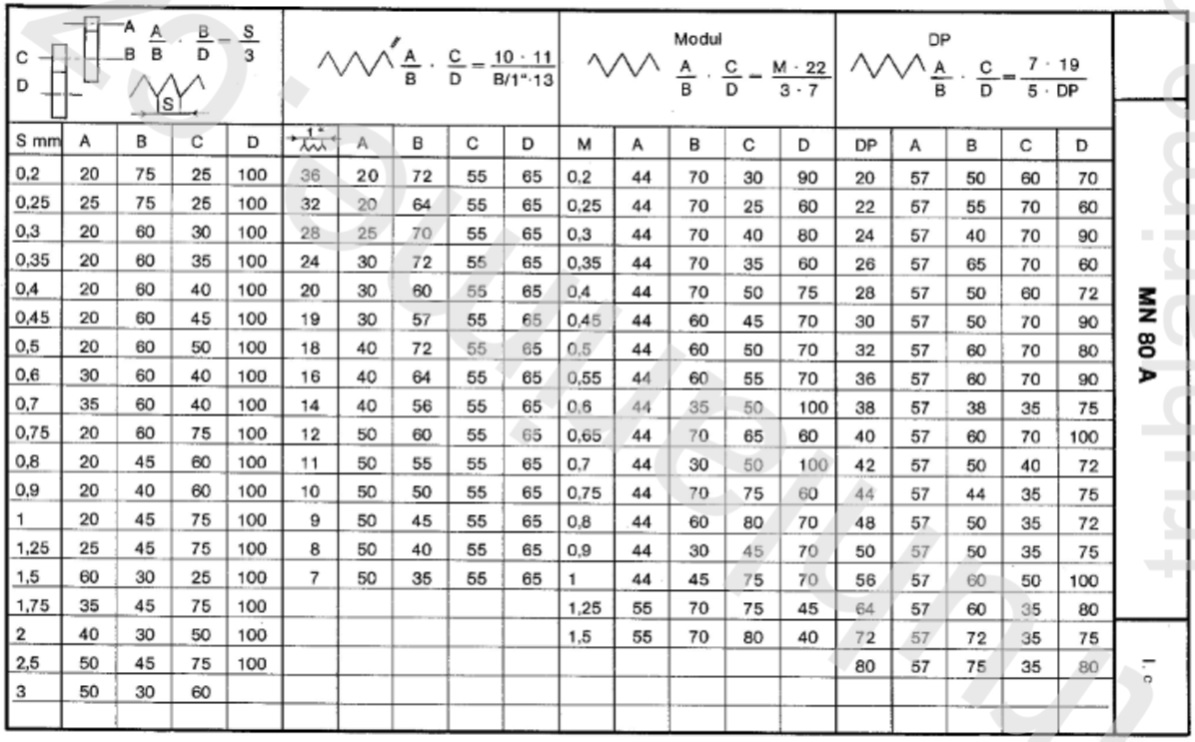 Mám jen standardní sadu závitových výměnných kol 20, 25, 30, 35, 40, 45, 50, 60, 75, reduktor 100.