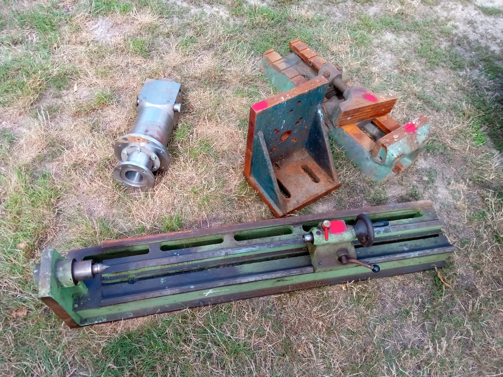 Tohle je strojařský peklo, byly tam i velký otočný svěráky, 200mm čelisti, svěráky na trubky. Ještě tam leží ta naklápěcí kostka, ta vypadala taky schopně. Naložit to na vozejk není problém.