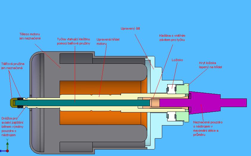 Nevím, jestli je opravdu možné v amatérských podmínkách vpodstatě zkonstruovat a zrealizovat systém pro automatickou výměnu nástrojů. Dle toho obrázku se to sice dost podobá systémům používaných v profi mašinách, ovšem přece jen vidím dost slabých míst. Především si dovolím pochybovat o tom, že je v možnostech amatéra celou sestavu rotoru dynamicky vyvážit. Nikoliv staticky (na břitech) ale skutečně dynamicky, protože pokud toto není naprosto perfektní, tak je to celé při vyšších otáčkách nepoužitelné. A toto samozřejmě platí i pro vlastní upínací kužel nástroje. Rovněž sytém uvolňování nástroje - jak chceš vyvozovat sílu, která nástroj uvolní? Pokud to má fungovat automaticky, je třeba aby to ,,něco´´ dokázalo vyvinout jednak poměrně velký tlak, ale tak, aby se nepřenášel axiálně na ložiska, ale zároveň aby to ,,něco´´ nebylo v žádném kontaktu s hřídelem pokud se nástroj nemění. I u profi řešení jsou tyto systémy nějčastější příčinou závady vřeten! Prostě - asi budu označen za sabotéra a skeptika - ale já si myslím, že je to natolik komplikované a náročné, že bych se do toho amatérsky nepouštěl. Ale jinak mohu klidně posloužit fotkou jak vypadá rotor (neboli cartridge) pro vřeteno na aut. výměnu, většinou jej fotím u zákazníka hned po vyjmutí, abych předešel sporům, jak vypadaly ložiska a pod.