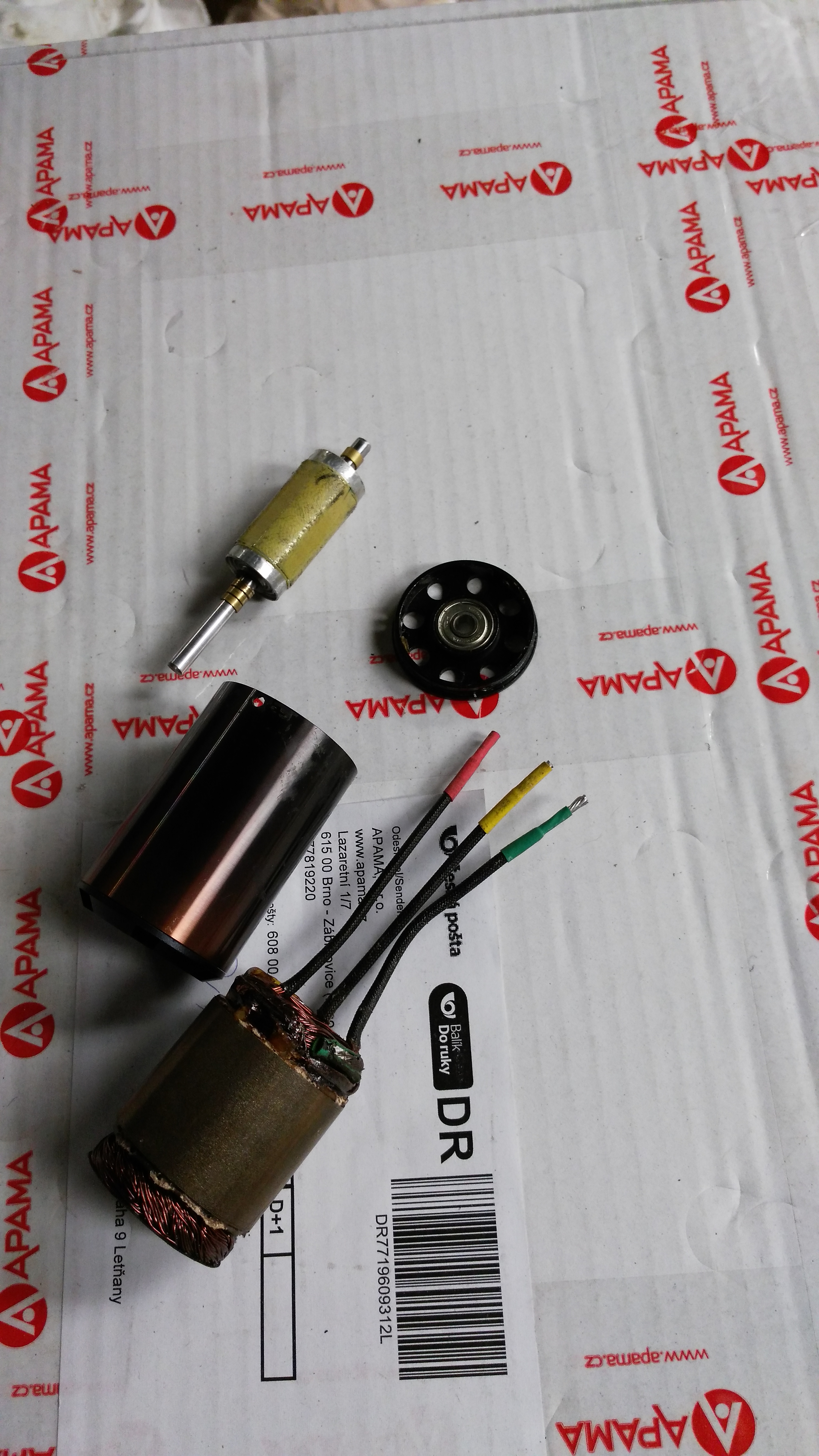 Jinak takhle vypadá rozebraný TP motor je to inrunner, budu ho převíjet na 50V a celkově upravovat aby padnul do vřetena co má točit 50 tis.