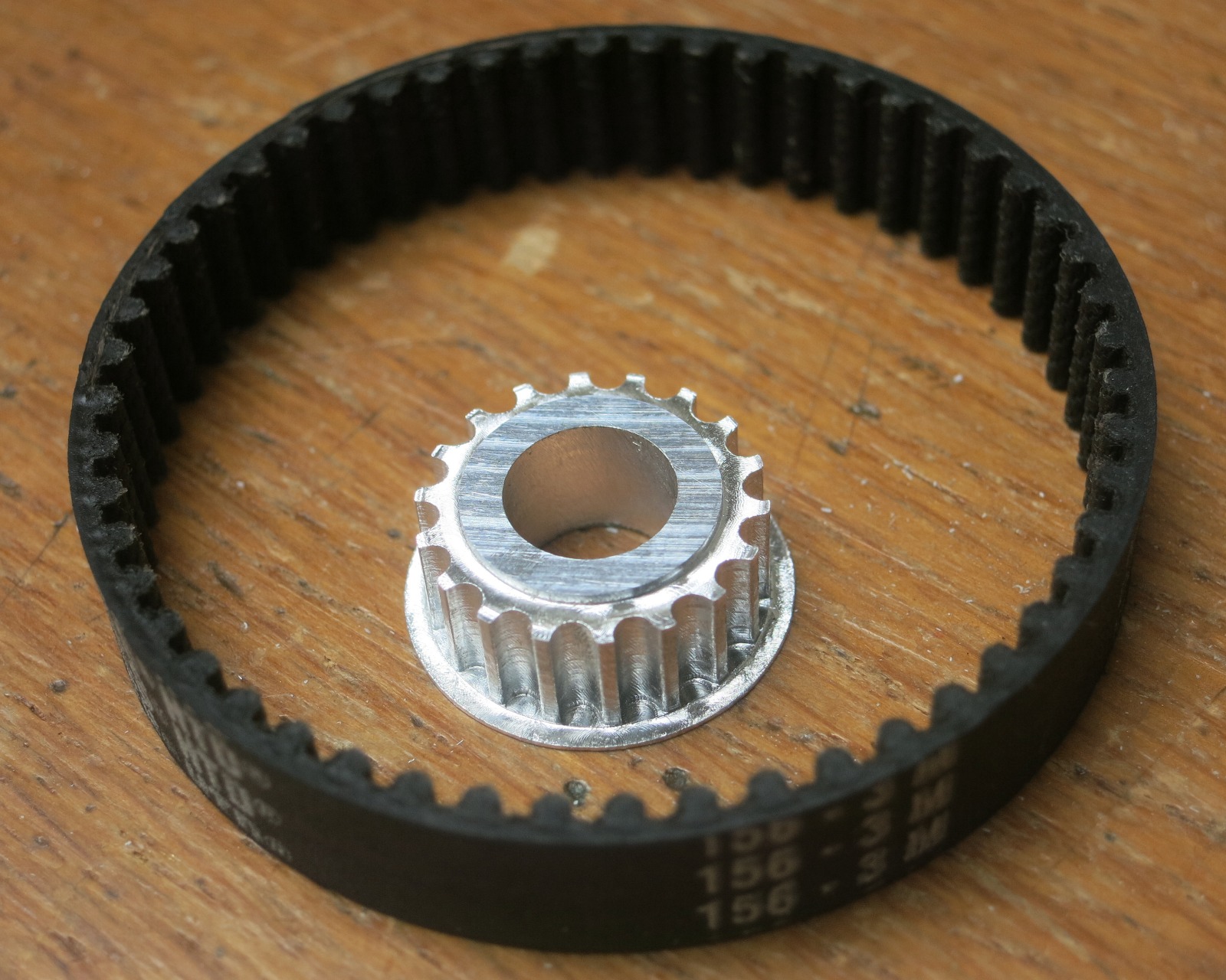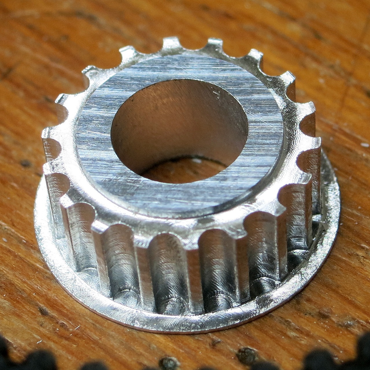 Tak moje duralová premiéra (z druhého nejtvrdšího duralu, který jsem doma měl, hohó), 18tizubá HTD 3M - pro vás rutina, pro mě adrenalin jak blázen (jak psal Mirek, poprvé je to nejlepší a já si to užil dosyta :)). K dokonalosti to má samozřejmě daleko, ale fungovat by to mohlo (ještě na to přijde nasadit druhý díl, který bude tvořit druhý rantlík, ale ten ještě budu muset vyrobit):