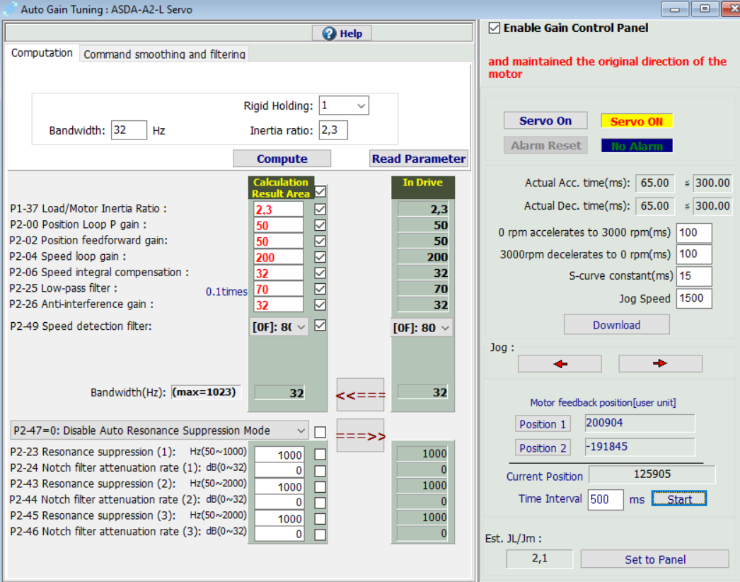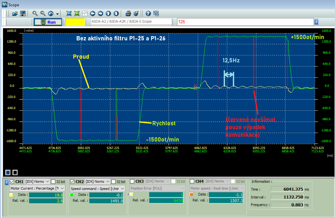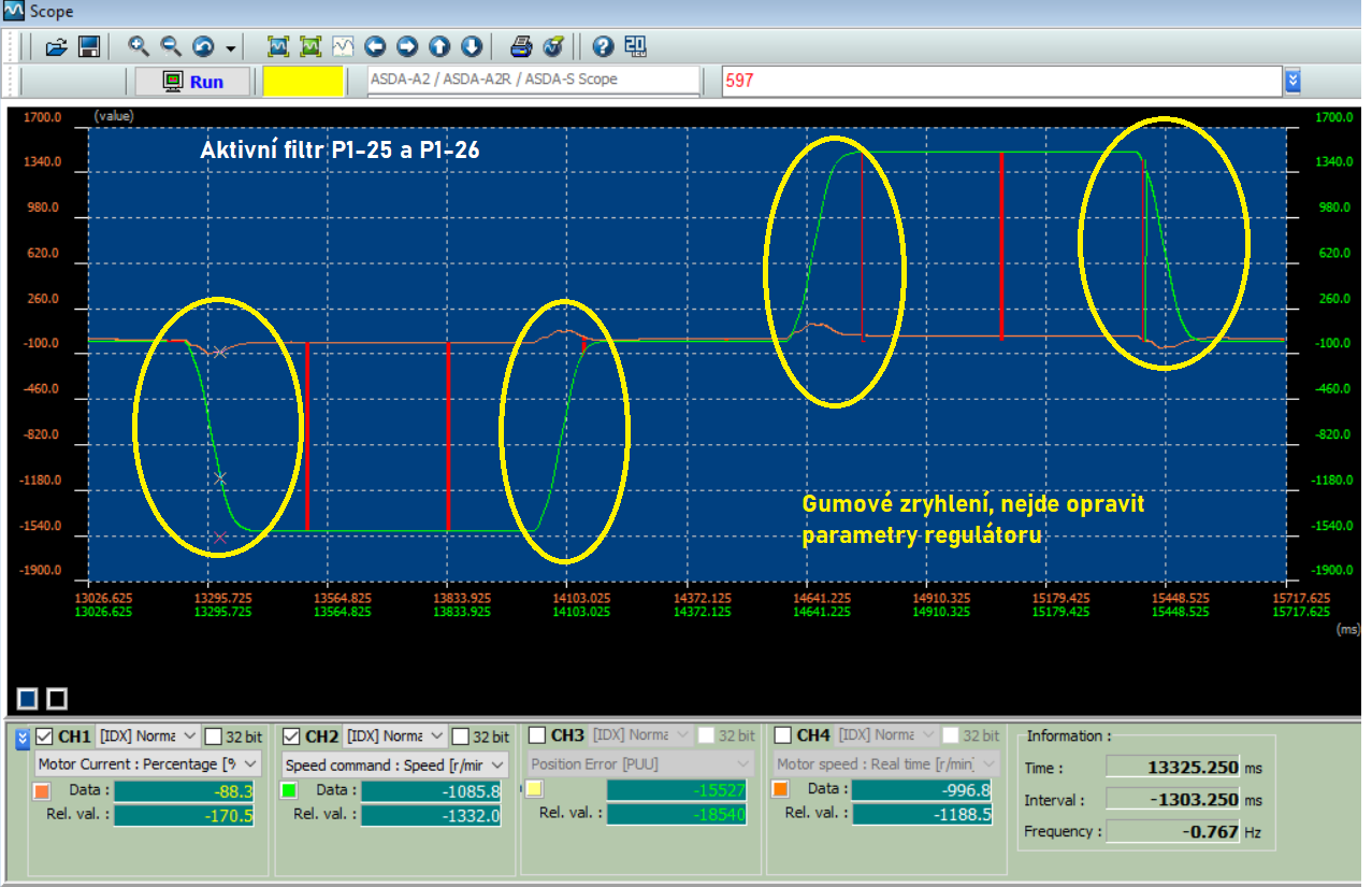 Dnes ladím servo osy Z a nepodařilo se mi odstranit oscilaci otáček po zrychlení osy. Perioda je vždy stejná, nezávisle na otáčkách . Pohybuje se v nízké frekvenci mezi 12 - 13Hz. Když hýbu klasickými parametry tak se amplituda postupně zmenšuje nebo zůstává stejná ale nejde odstranit.