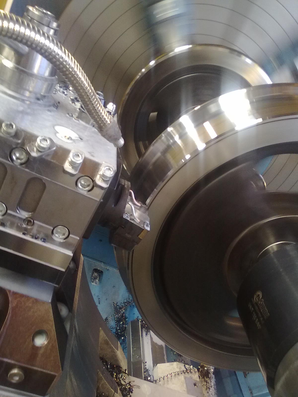 ta nehoda se stala při soustružení profilu na železničním kole a v okamžiku kdy jsem zastavil program tak nůž byl asi 10 mm před kusem,, nůž je v CAPTO držáku " no a tenhle prográmek hold zafungoval tak, že když jsem ho chtěl opět rozjet, tak si jel přes kus na výměnu nástroje,, sice nijak rychle ale tím jak to škrtlo břitem o obrobek, tak se mi v nožovce pootočil ozubený věnec a museli jsme ho zpátky srovnat a znova všechno překalibrovat,,,, už si na to dám majzla...