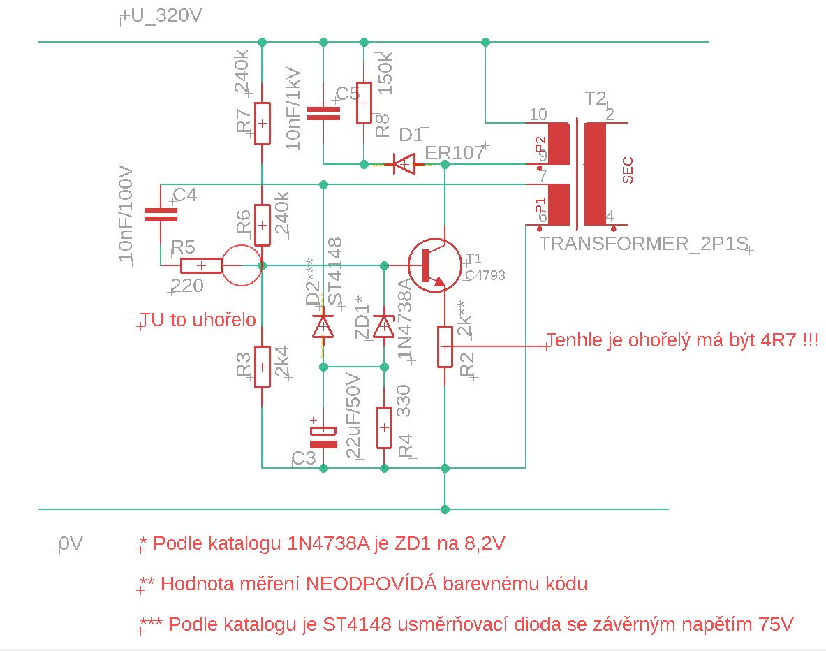 Ještě k tomu schéma - pokud ten ohořelý rezistor má hodnotu 4R7, tak tím tranzistorem opravdu musel proletět veliký proudový impusl!!!