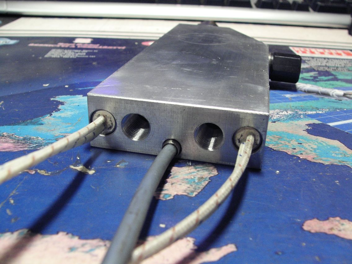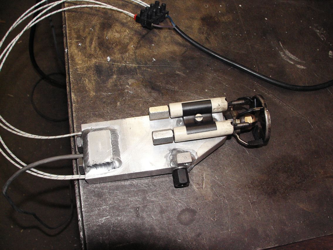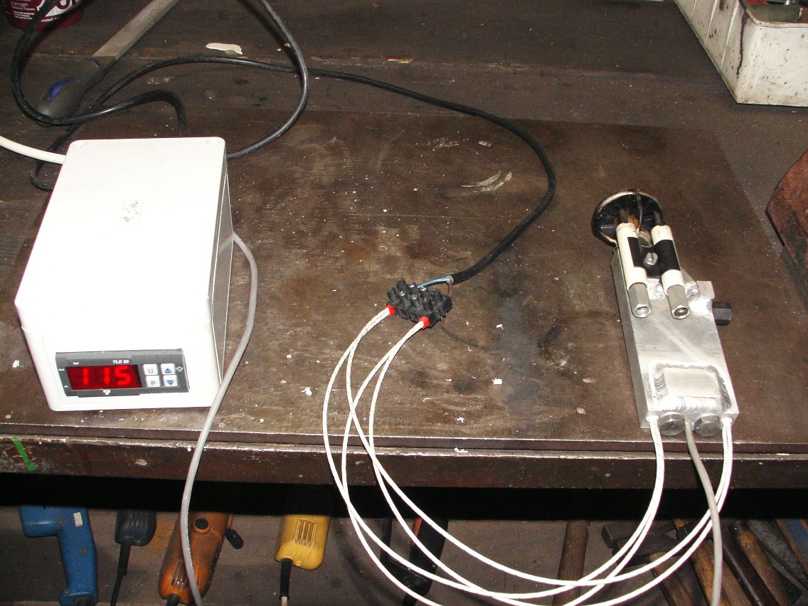 Další vize ohřívání oleje. Tentokrát speciální duralový monoblok se dvěma průtokovými kanály na olej, dvěma kanály pro osazení topných patron a měřícím kanálem pro Pt100. Celkový el. příkon 2 x 150W. Celý tvar a připojovací místa jsou naprosto identické s původním litinovým držákem trysky, takže při montáži co celé zaklapne na původní místo v hořáku. Pro připojení bude použita původní trubička, takže nebude nikde nic trčet navíc. Ještě musím vyrobit kostičku na kterou se přišroubují elektrody a ta se musí přibrnknout AC TIGem.