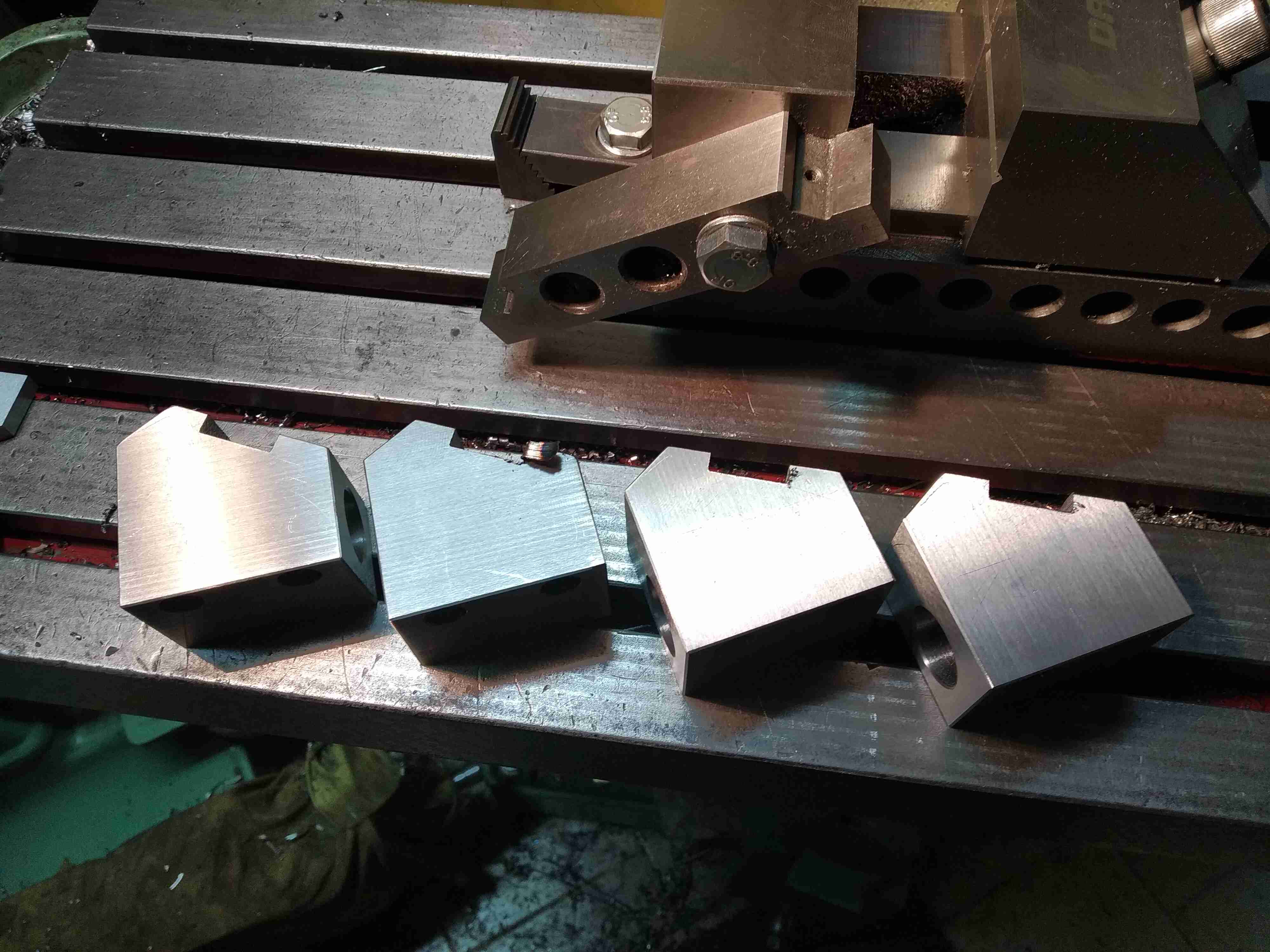 v kostce: kulatina, čela s přídavkem, ořez, broušení velkých ploch, zúhlování napřesno, hrany, otvor, vyvrtání napřesno, ohrabání hrubých úhlů a jejich broušení, pak stahovací šrouby, pak broušená fréza 60st. na jeden záběr, pak rozřezání, odhrocení, koupel, měření na trnu s posuvem